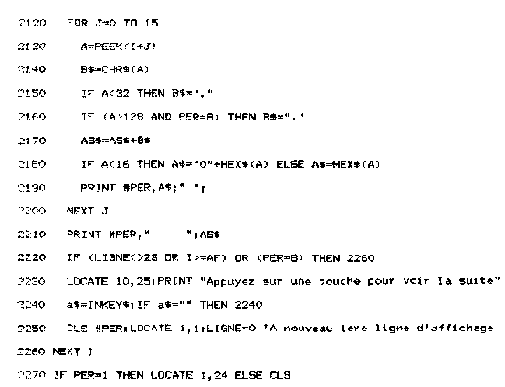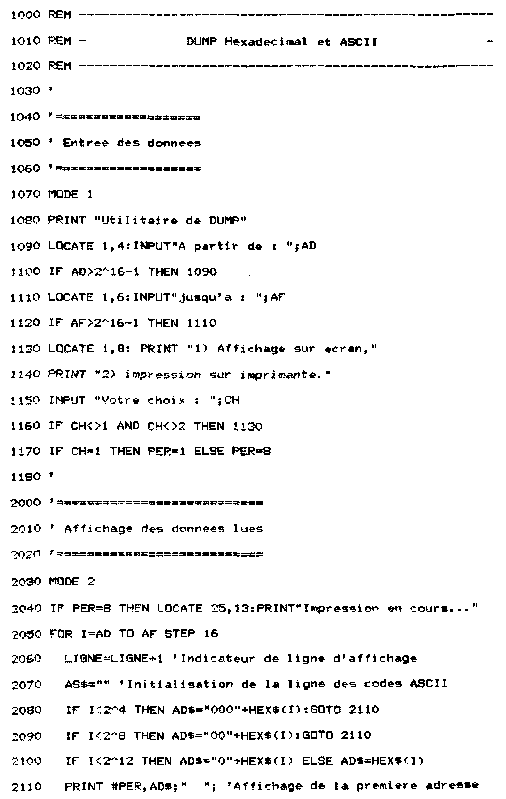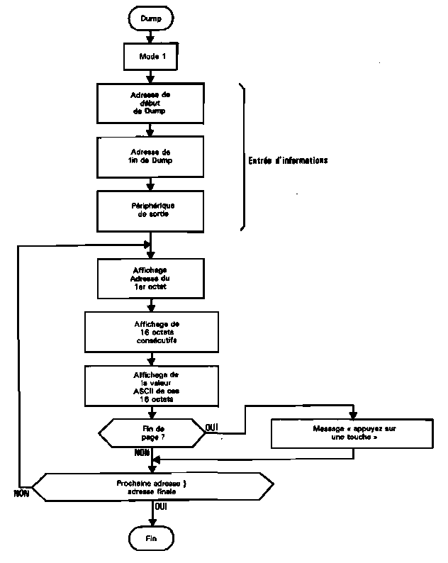 9/8.5.1 Programme de Dump en BasicAnalysons la structure du programme de Dump Basic. 1) Passage en MODE 1. 2) Entrée des informations concernant le Dump : – adresse de début de Dump (en décimal ou hexa. [précédé de &]) ; – adresse de fin de Dump (en décimal ou hexa. [précédé de &]) ; – choix de la sortie (écran ou imprimante). 3) Affichage/impression des données lues en mémoire : – adresse du premier octet ; – 16 octets consécutifs ; – valeurs ASCII de ces 16 octets ; – test de fin d'affichage/impression ; – poursuite éventuelle de l'affichage/impression. Ce qui se traduit par l'organigramme suivant :