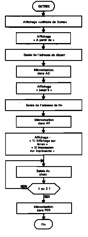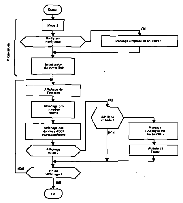 * Affichage des données ASCII correspondantes Les données ASCII affichables et imprimables sur des imprimantes clas siques ont des codes compris entre 32 et 128. Tous les autres code: sont systématiquement ignorés par le programme de Dump et rempla ces par un point décimal (.). Une fois les données ASCII affichées, la ligne de Dump suivante es amorcée : – dans le cas d'un affichage écran, si la 23" ligne n'a pas été atteinte Les différents tests et actions cités ci-dessus s'enchaînent comme le montre l'organigramme suivant :