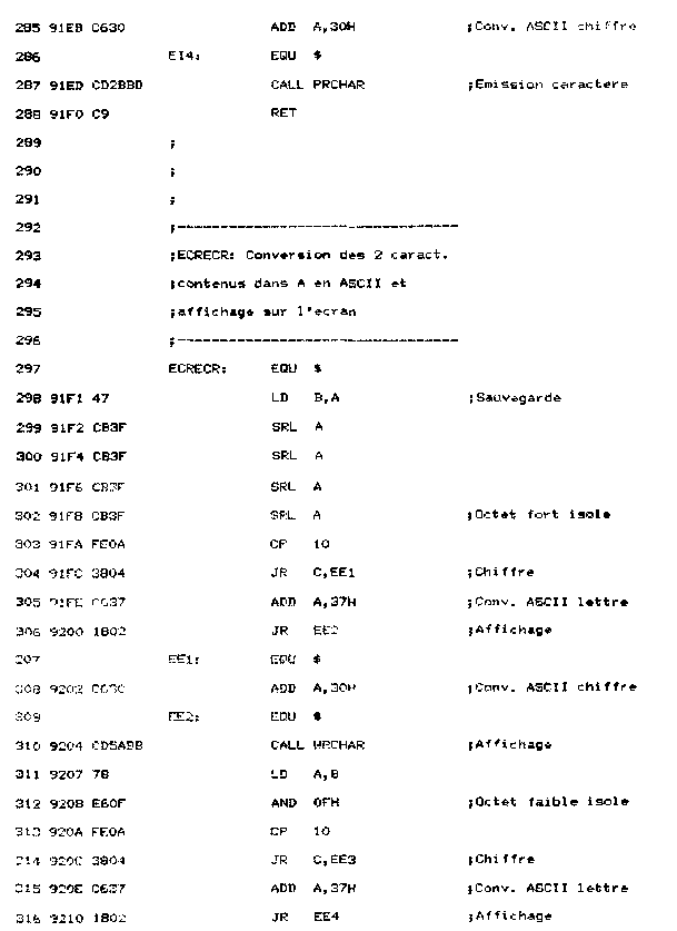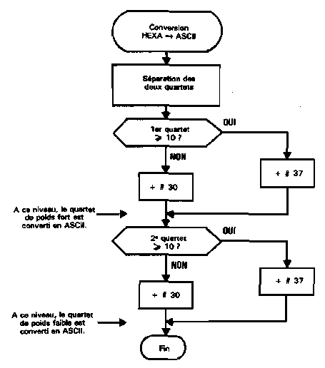 Affichage des données lues en mémoire Initialisation Pour augmenter le nombre de données par ligne (dans le cas où le résultat est sorti sur écran), le mode d'affichage choisi est le mode 80 colonnes (MODE 2). Ce mode est activé grâce à la fonction SCR SET MODE (#BC0E) du FIRMWARE. Si la sortie se fait sur Imprimante, le message « Impression en cours » est affiché sur l'écran, toujours grâce à la routine TXT OUTPUT. Affichage du DUMP L'affichage se réalise en trois étapes : – adresse ; * Affichage de l'adresse L'adresse est affichée/imprimée en utilisant une routine dont le but est de : Une telle routine est nécessaire car l'affichage ou l'impression ne peut se faire qu'à travers des caractères ASCII. La conversion HEXA – ASCII est faite en séparant l'octet de poids fort de l'octet de poids faible (chacun donnera un caractère ASCII). Chacun des deux quartets ainsi obtenus est comparé au chiffre 10. S'il est supérieur ou égal, le nombre # 37 est ajouté à quartet ; sinon, le nombre # 30 est ajouté au quartet. Ce qui se traduit par l'organigramme page suivante. * Affichage des données octets Chaque octet est affiché/imprimé en utilisant la routine de conversion/affichage décrite ci-dessus. A noter à ce sujet que deux routines ont