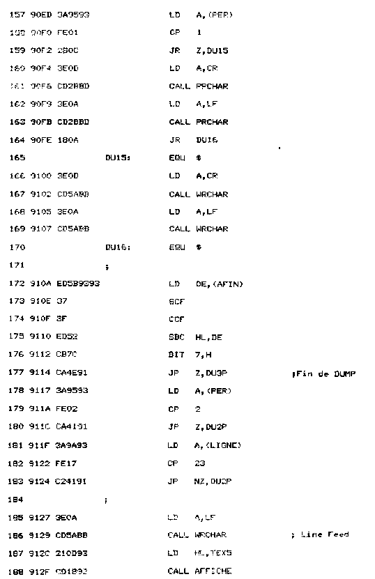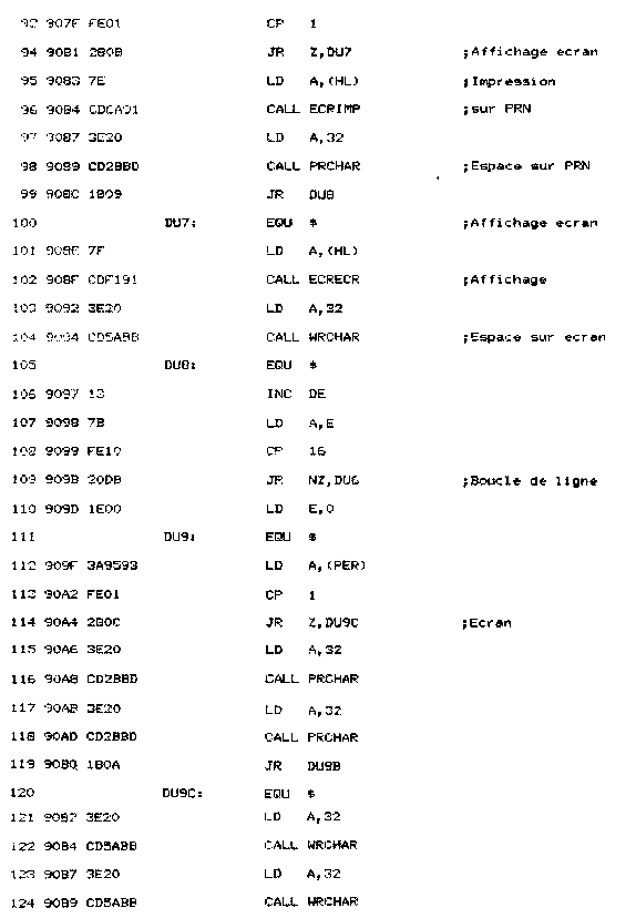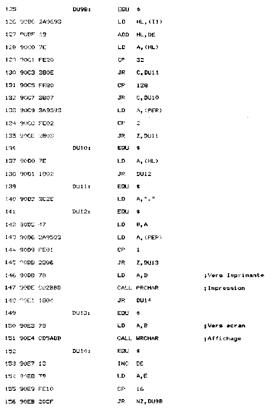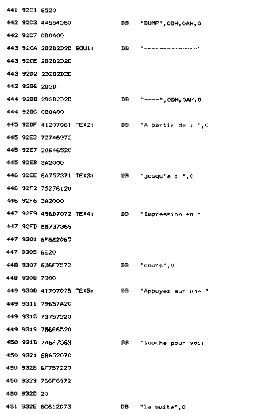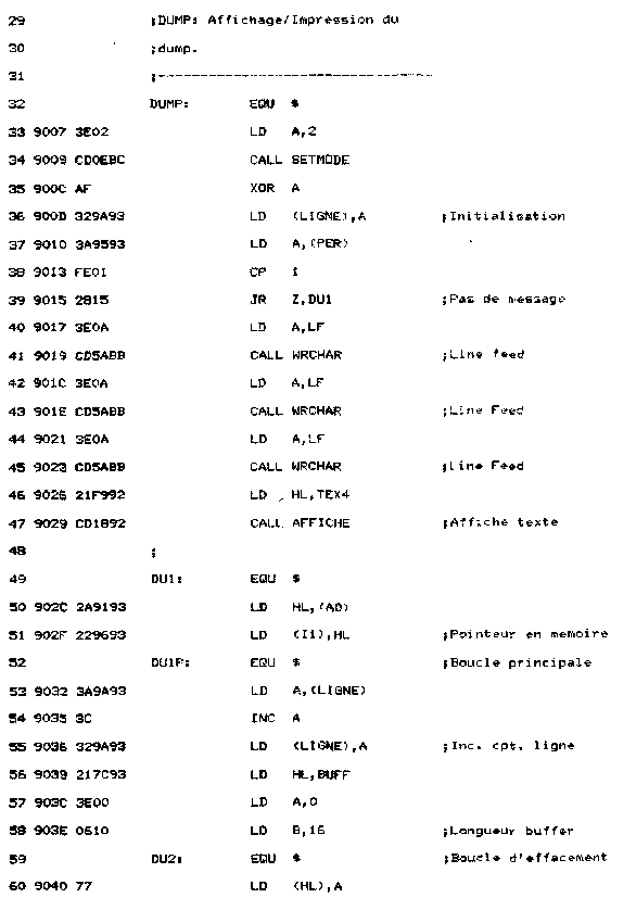 Dump sur imprimante avec le programme ASM de Dump de 6000 à 6100 Il est également possible (pour aller plus vite) de saisir les codes hexadé-cimaux correspondant au programme assembleur sous BASIC.
