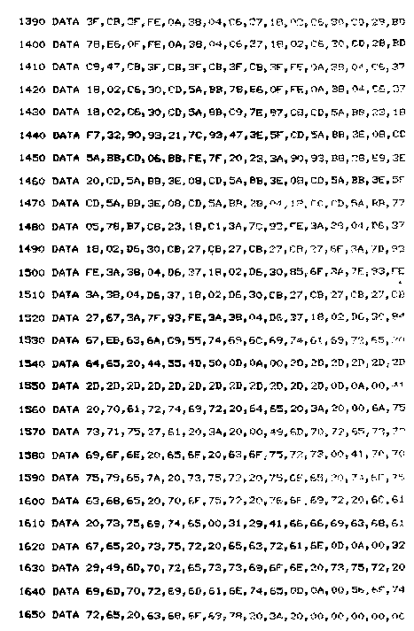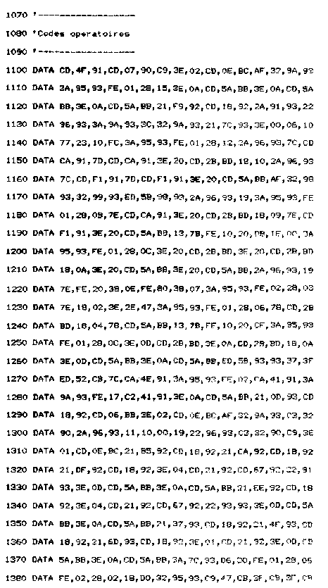 Si vous décidez d'entrer le programme assembleur sous Basic, vérifiez les codes entrés grâce au programme de checksum (voir Partie 9, chap. 8.4). C6 30 7F B4 E3 95 59 38 5F B7 87 14 32 4F 27 57 42 6F 95 Î9 F9 72 4B 77 DA 1E 1F C1 62 55 79 80 A6 DC 5C CE F5 7D C8 A7 E4 4A 5 2B 47 76 F8 43 AB 2D E8 4B BC F1 8B 8F Si une ou plusieurs des données de vérification ne correspondent pas avec celles données ci-dessus, vérifiez la ligne correspondante. Remarque : Plusieurs données ont été rajoutées en fin de listing afin d'assurer la compatibilité avec le programme de checksum.