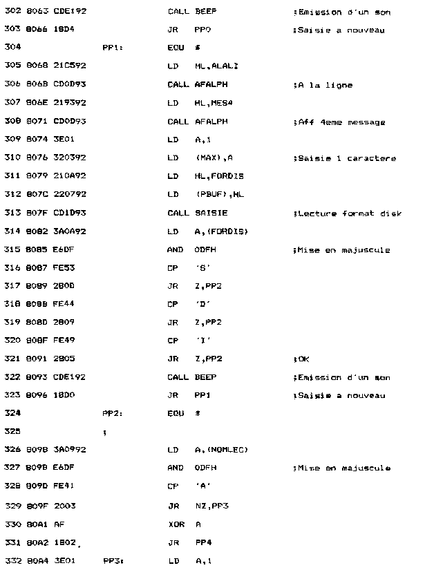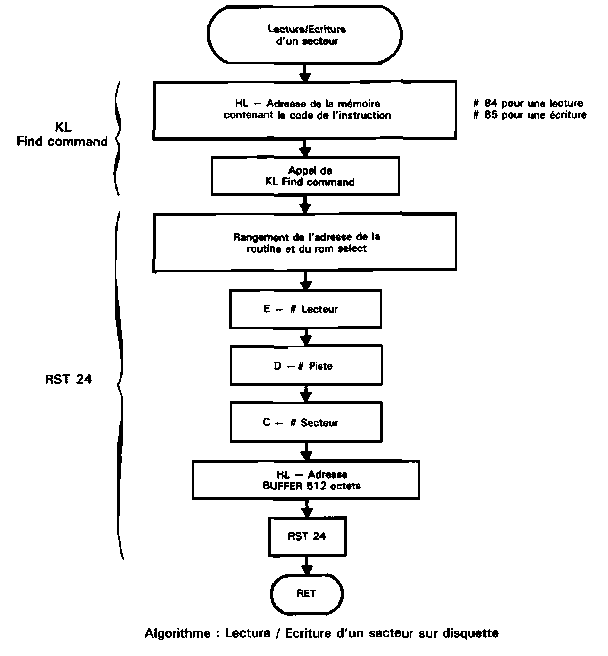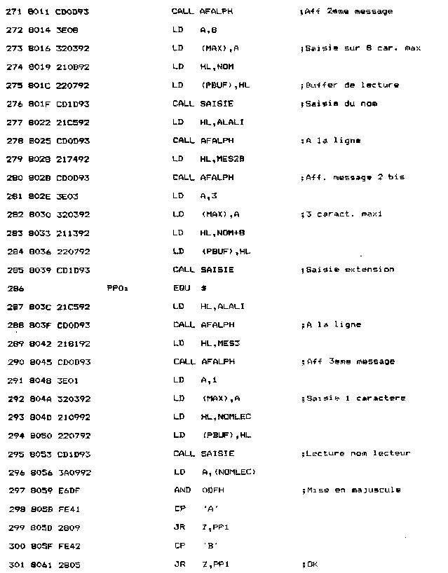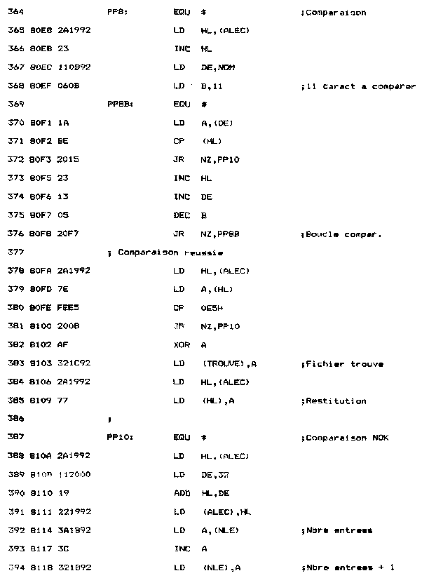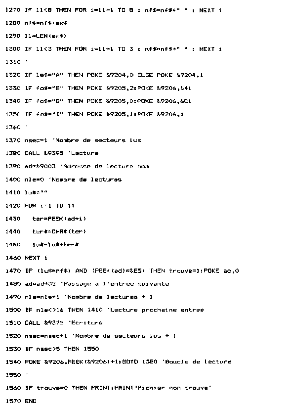 9/8.6 Récupération d'un fichier effacé par la commande |ERAVous connaissez sans doute l'instruction |ERA,"nomfic.ext" du Basic Amstrad qui vous permet d'effacer un fichier sur une disquette. Lorsqu'une telle commande est activée, le fichier spécifié n'est pas supprime physiquement de la disquette: il est seulement marqué « absent » dans le catalogue, et, de ce fait, il n'apparaît plus lorsque vous demandez le répertoire de la disquette. Partant de cette remarque, il vient tout de suite à l'esprit qu'un fichier supprimé par la commande IERA peut être restitué en effaçant la marque « absent » du répertoire. C'est effectivement le cas si aucune opération d'écriture sur la disquette n'a été faite depuis l'effacement. Effectivement, les commandes d'écriture sur disquettes sont autorisées à écrire sur les fichiers marqués « absent » (sinon, à quoi ia commande IERA servirait-elle ?). Voyons en détails la façon de procéder pour récupérer un fichier effacé. Définitions – On appelle secteur un certain nombre d'octets consécutifs situés sur la disquette (512 octets pour Amstrad CPC). Un secteur est la quantité minimale d'informations accédée à chaque lecture sur disquette ou disque dur. Sachant que : Structure détaillée du catalogue Une des fonctions fondamentales d'un système d'exploitation, quel qu'il soit et quelles que soient ses origines, est de faciliter la gestion des fichiers sur les supports de sauvegarde de masse (lecteurs de disquettes ou de disques durs). Pour ce faire, les systèmes d'exploitation font appel à un répertoire (souvent appelé catalogue sur les ordinateurs CPC) qui contient les informations nécessaires pour retrouver rapidement les fichiers sur le support mémoire. Ces informations sont les suivantes : Examinons en détails les données enregistrées dans le répertoire pour chaque fichier. Par la suite, nous appellerons entrées l'ensemble des données permettant d'accéder à un fichier dans le répertoire. Chaque entrée comporte 32 octets dont voici la signification : Octet 00 ;: Numéro de USER du fichier (00 à 0F), ou indicateur de fichier « absent » (effacé par une commande |ERA). Lorsqu'un fichier a été effacé, cet octet contient la valeur #E5. Octets 01 à 08 : Nom du fichier, complété par des caractères « Espace » (#20) si nécessaire (si la longueur du nom est inférieure à 8 caractères). Si cet octet vaut #80 (128), une « extension « suit car une entrée ne peut référencer que 16 Koctets (effectivement, une entrée ne peut comporter que 16 numéros de blocs, donc 16 Koctets. (Cf. Octets 10 à 1F.) Octets 10 à 1F : Numéros de blocs occupés par le fichier. Précisons encore que la position du répertoire dépend du format de la disquette. Une disquette peut être formatée en « Système », « Data »ou « Ibm ». – si la disquette est au format système, le catalogue se trouvera sur la piste 2, secteurs 65 à 69 ; Ainsi l'octet 0 d'une entrée contiendra la valeur #E5 si ce fichier a été effacé, ou un numéro d'USER. Pour qu'un tel fichier soit à nouveau accessible, il suffira de charger l'octet 0 de l'entrée correspondante avec la valeur 0. Utilisation des instructions « KL FIND COMMAND », « READ SECTOR » et « WRITE SECTOR » Instruction « READ SECTOR » (&84) du lecteur de disquettes Une des instructions cachées du lecteur de disquette est « READ SECTOR ». Cette instruction permet d'accéder à un secteur quelconque de la disquette. Nous allons l'utiliser pour lire ta valeur d'une entrée dans le répertoire. Instruction « WRITE SECTOR » (&85) du lecteur de disquettes Une autre instruction cachée du lecteur de disquettes est « WRITE SECTOR ». Accès aux instructions « READ SECTOR » et « WRITE SECTOR » à travers la macro instruction KL FIND COMMAND L'instruction « KL FIND COMMAND » du Firmware est située à l'adresse #BCD4. Elle permet de trouver l'adresse d'une instruction de type RSX ou d'une commande externe de la ROM basse de l'Amstrad. Elle permet, en outre, de trouver les adresses des commandes de lecture et d'écriture « READ SECTOR » et « WRITE SECTOR ». L'instruction « KL FIND COMMAND » combinée à un RESTART 24 permettra d'activer la lecture ou l'écriture d'un secteur de la disquette. L'adresse en mémoire où se trouve le nom de la commande à accéder doit être fournie en entrée de cette routine dans le registre HL. interfaçage du RESTART 24 Les registres C, D, E et HL sont utilisés en entrée. Ils doivent contenir les informations suivantes : Nous pouvons maintenant réaliser assez facilement des programmes en assembleur de lecture et d'écriture d'un secteur de la disquette. Ces deux programmes respecteront la logique suivante :