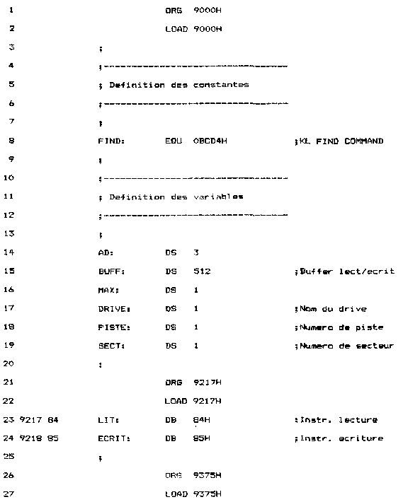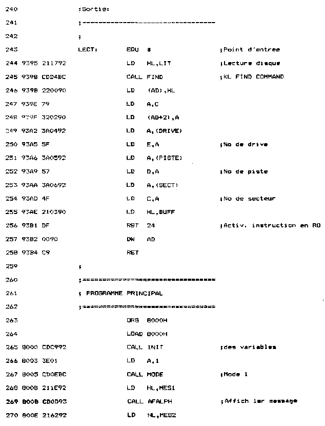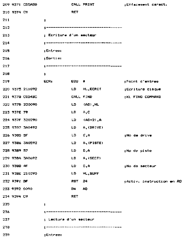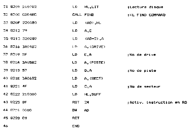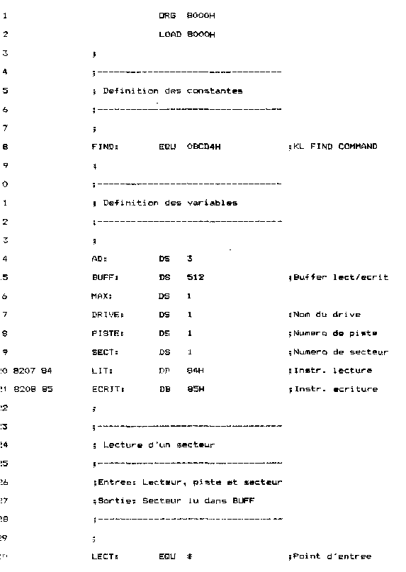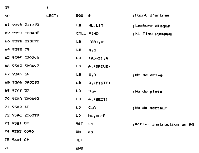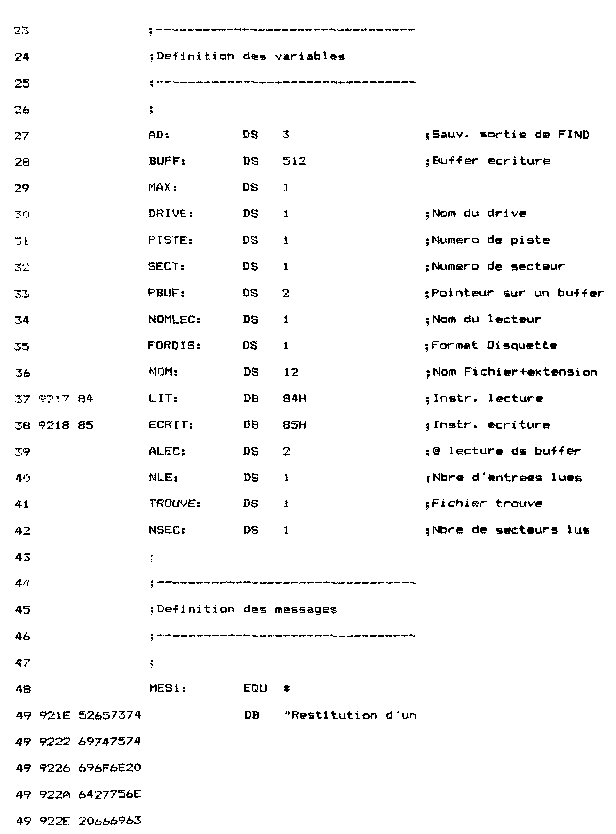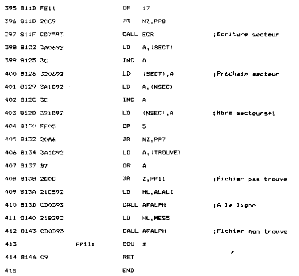 Programme de restitution de fichiers en version Assembleur Le programme Assembleur de restitution reprend les opérations détaillées dans l'algorithme précédent. Les routines de lecture et d'écriture d'un secteur sont implantées aux mêmes adresses que dans le programme Basic.