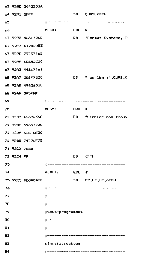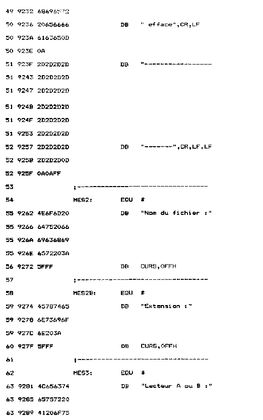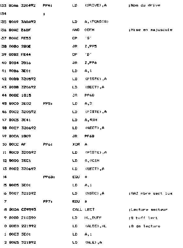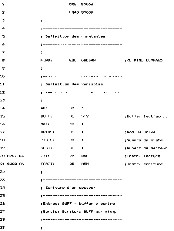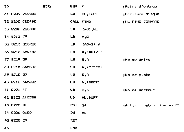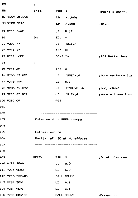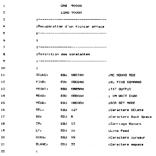 Programme de restitution de fichiers en version Assembleur Le programme Assembleur de restitution reprend les opérations détaillées dans l'algorithme précédent. Les routines de lecture et d'écriture d'un secteur sont implantées aux mêmes adresses que dans le programme Basic.