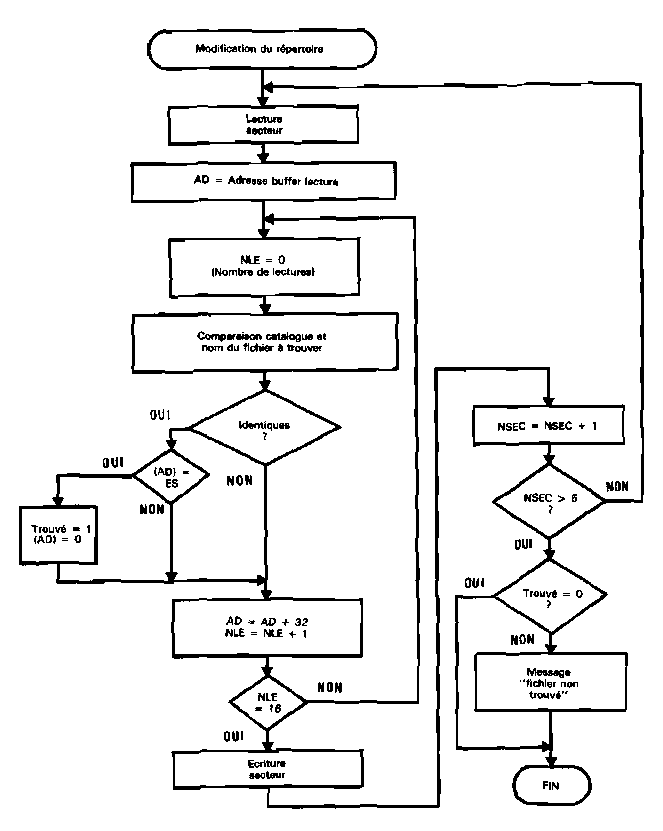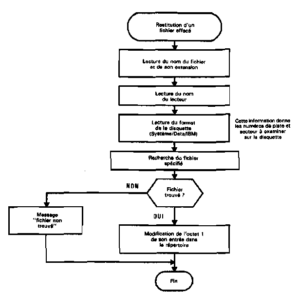 Ces programmes élémentaires vont être agrémentés d'une interface utilisateur qui permettra d'entrer le nom et l'extension du fichier effacé à retrouver. Ce fichier sera cherché sur la disquette spécifiée, et le premier octet de son entrée dans le répertoire sera modifié si nécessaire. Si le fichier spécifié n'est pas trouvé dans le répertoire, le message 'Fichier non trouvé' sera affiché à l'écran. Le programme de restitution est présenté dans deux versions : totalement assembleur et basic plus assembleur. Interface utilisateur Cette interface consiste à lire : – le nom et l'extension du fichier à retrouver ; Le fichier est recherché dans la totalité du catalogue. Si le fichier spécifié est rencontré dans le catalogue, le premier octet de l'entrée correspondante est comparé à #E5. S'il est égal à cette valeur, il est mis à 0 pour être accessible sous un numéro d'USER quelconque. Si le fichier spécifié n'est pas trouvé dans le catalogue ou s'il est trouvé mais avec le premier octet de son entrée différent de #E5, le message 'Fichier non trouvé' est affiché et le répertoire est laissé intact. Ces diverses actions sont résumées dans l'algorithme suivant. Restitution d'un fichier effacé