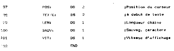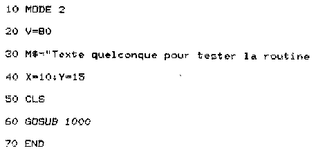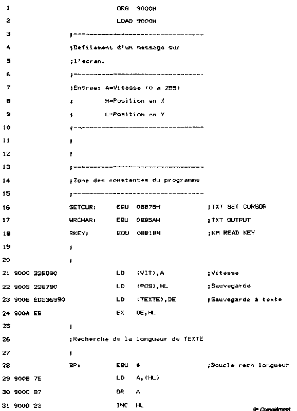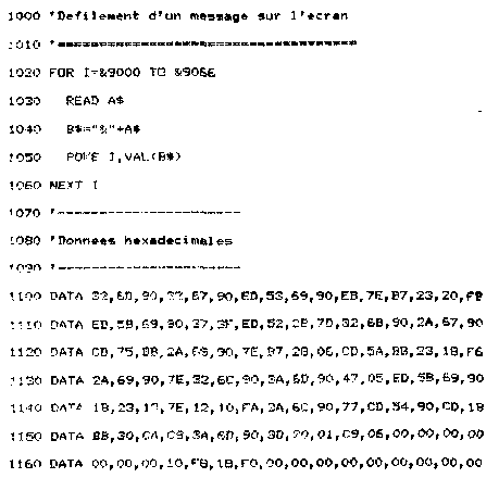 9/8.7 Défilement d'un message alphanumérique sur l'écranCe programme va être présenté dans deux versions : Basic et Assembleur. Il vous sera également possible d'entrer les données hexadécimales correspondant aux codes opératoires sous Basic. Version Basic Un message alphanumérique quelconque peut être affiché n'importe où sur l'écran, en mode 0, 1 ou 2. Pour cela, il faut placer le message à afficher dans la variable M$. Les coordonnées absolues d'affichage du premier caractère sur l'écran sont placées dans les variables X (abscisse) et Y (ordonnée). La vitesse de défilement est enfin indiquée dans la variable V. L'affichage est déclenché en faisant un « GOSUB 1000 », comme le montre l'exemple suivant :