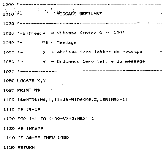 Le décalage se fait en trois étapes : – isoler la première lettre de la chaîne ; – copier les caractères suivants dans la chaîne de départ ; – placer lé caractère isolé en fin de chaîne. Cette manipulation est faite lignes 1100 et 1110. La boucle d'attente paramétrée se fait ligne 1120. Elle consiste à faire une boucle FOR NEXT dont la longueur dépend de la vitesse définie dans la variable V. Le listing du programme est le suivant :