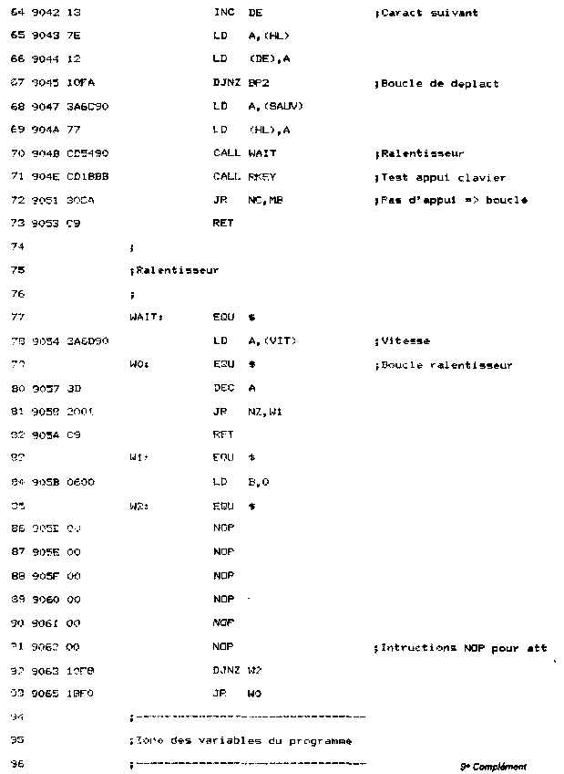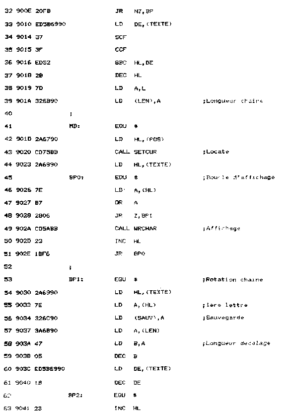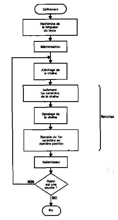 Version Assembleur Même si la vitesse d'exécution d'un programme écrit en Assembleur n'est plus à démontrer, vous serez peut-être surpris par le programme qui suit. Il reprend les concepts exposés pour le programme de défilement Basic. Trois routines du FIRMWARE sont utilisées pour faciliter l'écriture du programme. Il s'agit de : – TXT SET CURSOR (#BB75) qui positionne le curseur à un endroit quelconque de l'écran ; – TXT OUTPUT qui affiche un caractère à la position courante du curseur ; – KM READ KEY qui lit le code d'une éventuelle touche actionnée sur le clavier. Le programme se décompose en cinq parties : – recherche de la longueur du texte à afficher. Précisons à ce sujet que le texte à afficher doit être suivi du caractère terminateur « nul » de code ASCII 0 ; – affichage de la chaîne jusqu'au terminateur ; – rotation de la chaîne, – ralentisseur. Il consiste en une boucle qui utilise l'ordre DJNZ. Cette boucle contient 6 ordres NOP qui n'ont aucune action particulière, si ce n'est demander un cycle machine pour être exécutés. – test, si une touche a été actionnée. Si oui, arrêt du programme et retour à l'appelant. Ces diverses actions se retrouvent dans l'organigramme ci-dessous :