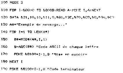 Il est également possible de saisir les codes hexadécimaux correspondant au programme Assembleur dans un programme Basic. Le listing du programme est alors le suivant :