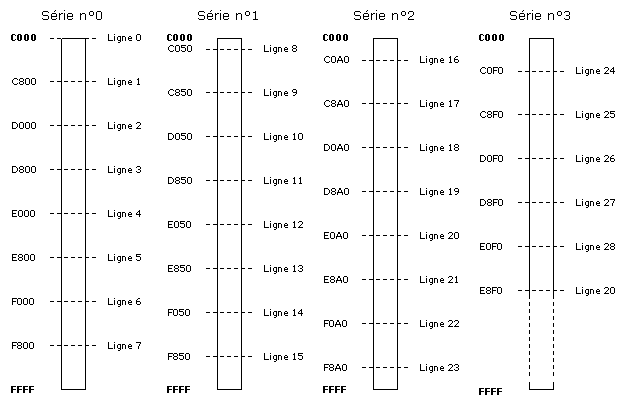 La taille de la mémoire graphique, rappelons-le, fait 16 ko. Chaque ligne est entrelacée avec les autres et la largeur d'une ligne fait 80 caractères (octets).