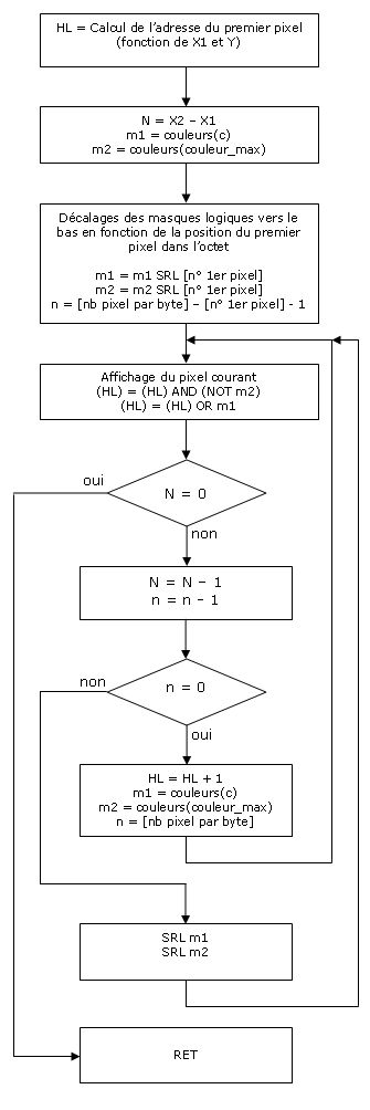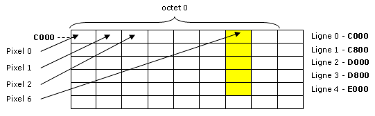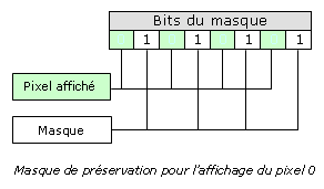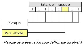 Comme dans l'exemple précédent, le masque logique associé à la couleur est décalé vers la droite de 1 bit pour chaque pixel allumé ; au passage, le masque de préservation des données voisines aussi. Tout çà juste pour vous dire que notre algorithme doit prendre en compte la position du premier pixel pour calculer les masques logiques et les décalages suivants.