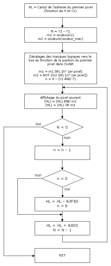Voilà pour l'algorithme. Cet algorithme n'est pas compliqué mais comme vous le savez les registres du Z80 étant peu nombreux il va falloir le coder notre routine le plus proprement possible.