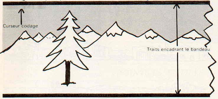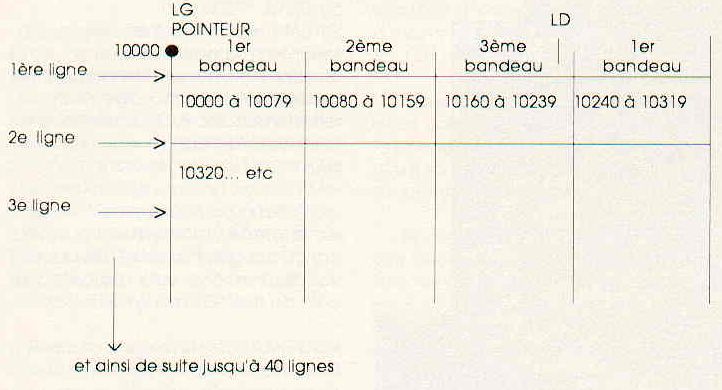 SI tout marche bien, nous avons memory 29199 adresse de chargement conseillée = 29200. nombre de bandeaux différents 3, largeur 80 et hauteur 40. Occupation = 12800 octets. En cas de problème, appuyez sur R et recommencez tout le processus ; autrement S pour suite. Introduisez la disquette portant le dessin, un catalogue sera édité pour vous permettre de vérifier. Votre dessin apparaît à l'écran. Les couleurs ne sont pas évi- Appuyez sur la barre d'espace, un son et un clignotement du border Indiqueront que le 1er bandeau a été codé. Il l'a été deux fois mais AUTOMATIQUEMENT. n'appuyez donc pas une deuxième fois sur la barre d'espace. Passez au deuxième puis au troisième bandeau en vous plaçant toujours juste sous le filet de repérage avant de presser la barre d'espace. Pour éviter d'avoir des programmes fleuves à saisir et assurer le fonctionnement sur tous les types de machines, le programme ne possède que des sécurités minimum : empêchement de coder trop de bandeaux, affichage des catalogues avant load ou save. Un message vous rappelle d'insérer une disquette et vous pouvez en changer en cas d'erreur. Pour les éternels étourdis, en cas a erreur Interrompant de manière définitive le programme, refaites RUN, ce qui a été fait précédemment ne sera plus pris en compte et recommencez la procédure. Voilà décrit notre utilitaire de codage ! A ce stade, nous possédons un fichier DESSIN 1 .BIN qui contient les données numériques représentant nos bandeaux. DESSOUS DE TABLE • Ces explications sont pour ceux qui voudraient savoir comment la routine principale procède et comment ont été codés les dessins. Ceux qui ne sont pas Intéressés, si. si, il y en a plus qu'on ne croit, peuvent passer directement au paragraphe suivant : syntaxe et fonctionnement des RSX. Ce paragraphe est surtout destiné à montrer une des manières de résoudre un problème donné et donc de vous permettre de réfléchir pour trouver d'autres solutions : plus rapide, moins gourmand en mémoire vive, pourrait-on compiler les dessins ? Dans le cas présent, le dessin a été codé de cette manière : on relève le contenu des 80 cases mémoire constituant la 1 ère ligne horizontale du bandeau 1 et on les Inscrit en mémoire vive à partir de l'adresse 10000. Arrivé en 10079, on saute 240 adresses qui permettront de coder la 1ère ligne du deuxième bandeau, celle du troisième et encore une fols celle du premier ; on inscrit alors les valeurs de la 2ème ligne du bandeau, on repasse 240 adresses, troisième ligne du premier bandeau... et ainsi de suite pour les 40 lignes constituant la hauteur de notre bandeau. Venons-en maintenant au pourquoi du codage supplémentaire du 1er bandeau. Sur le graphisme précédent, vous voyez inscrit LG et LD, ce sont des adresses situées sur la première ligne des codages des trois bandeaux : elles Indiquent la limite gauche et la limite droite que notre pointeur ne doit pas passer.
