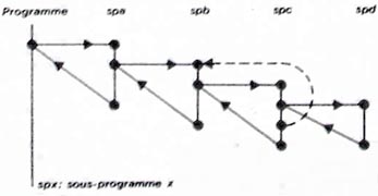 Lorsque vous programmez, l'utilisation intensive des sous-programmes appelle un certain nombre de réflexions que nous allons tenter d'étudier brièvement. a. Rapidité: lorsque vous programmez un algorithme donné en linéaire, vous obtenez une certaine rapidité d'exécution R. Si vous programmez ce même algorithme en vous aidant de sous-programmes, dune part vous aurez un certain nombre d'instructions surnuméraires par rapport a la programmation linéaire (les appels aux routines et tes instructions indiquant la fin de celles-ci), d'autre part vous aurez peut-être supprimé certaines redondances de programmation. b. Occupation mémoire : tout comme dans te cas de la rapidité, nous allons avoir une augmentation du nombre des instructions (appels et retours des sous-programmes), mais lorsque vous utilisez tes routines c'est pour éliminer des redondances de programmation. Ce que vous perdrez donc comme place en appels et retours, vous le gagnerez plus que largement en supprimant tes redites de la programmation linéaire. c. Complexité : un algorithme. qu'il soit programmé en linéaire ou a l'aide de sous-programmes, aura en permanence la même complexité En effet, quête que soit votre méthode de programmation, si vous l'avez optimisée dans les deux cas (linéaire ou non-linéaire ), elle aboutira à une complexité équivalente. Ce critère ne jouera donc pas dans te choix d'un type de programmation par rapport a l'autre. Revenons brièvement sur la notion des appels imbriqués, en donnant une nouvelle fois un conseil qui vous évitera de planter définitivement votre micro. Nous avons vu précédemment qu'a partir d'un sous-programme , il fallait éviter impérativement de réaliser un appel a ce sous-programme . Mais regarder a nouveau le schéma des appels imbriqués. Vous remarquez que, comme pour les boucles imbriquées du Basic, une routine ne fait jamais à une routine moins profonde. Imaginons la structure de programme suivante, et regardons-en la représentation graphique associée. Nous allons, pour simplifier la lecture du programe, utiliser l'instruction du micro-processeur 6502 JSR (qui signifie : Jump to SubRoutine, ou appel à un sous-programme). Programme Plantage 10 PAS 1 20 PAS 2 30 JSR a 40 AFFICHAGE DES RESULTATS 50 FIN Sous-programme a 100 PAS 1 110 JSR b 120 RETOUR Sous-programme b 200 PAS 1 210 PAS 2 220 JSR c 230 RETOUR Sous-programme c 300 PAS 1 310 JSR d 320 PAS 2 330 JSR b 340 RETOUR Sous-programme d 400 PAS 1 410 PAS 2 420 PAS 3 430 RETOUR Vous avez le programme, regardons maintenant te schéma qui représente te cheminement du microprocesseur lors de l'exécution de ce programme.  Appels du programme Plantage