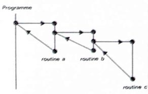 Vous saisissez sans aucun doute maintenant l'importance des organigrammes dans la conception d'un programme, car si votre programmation surt scrupuleusement vos dessins, vous ne devriez pas aboutir a des résultats aussi surprenants et gênants que celui décrit précédemment. Mais ta capacité de la prie système limite d'une autre manière le recours aux routines. Cette limitation porte un nom aussi évocateur que celui de l'adresse de retour, puisqu'il s'agit de la limitation en profondeur dans les appels aux sous-programmes. Revenons a la taille N de notre pile. Lorsque vous faites appel à une routine, le micro-processeur empile l'adresse de retour et lorsqu'il a terminé l'exécution de la routine concernée, ri dépite l'adresse en la plaçant dans le compteur ordinal (ou PC). Imaginons qu'à partir d'une première routine nous en appelions une seconde qui e«e-même en appelle une troisième et ainsi de suite. De la même manière que précédemment nous allons nous retrouver, a un instant ou a un autre, limités par la capacité N de la prie système La limitation en profondeur est une valeur qui correspond simplement au nombre d"appels que l'on peut enchaîner sans dépasser ta capacité de la pile système. Nous allons pouvoir illustrer cette limitation en profondeur de la manière suivante en nous servant de la notion d'appels imbriqués. Cette expression ne de vrait pas trop vous dérouter elle est très proche dans la forme mais aussi dans le fond du principe des boudes imbriquées.  Appels imbriqués