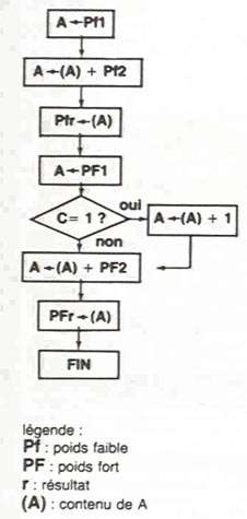 En voici l'algorithme qui en découle directement : 100 charger dans A le premier octet de poids faibleDans cette méthode, nous n'aurons donc à nous préoccuper de la retenue qu'après avoir effectué et rangé le résultat de notre première addition. Si vous désirez étendre cet algorithme a plus de deux octets, il vous suffira de dupliquer la séquence des lignes 130 à 170 de notre algorithme.