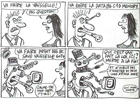 AU COMMENCEMENT FUT LA SUITEOù en était-on ? A cet atroce petit programme commenté d'un "devinez" écrit en charabias (non, c'était de l'assembleur). Votre cervelle a dégouliné pendant trois semaines sur le bas de la page de notre dernier cours d'assembleur ? Alors là, je ne suis pas d'accord. Il faut suivre. Surtout qu'on vous a déjà dit que c'était simple... (Solution des Jeux : le programme était destiné à vous montrer la valeur du pointeur de pile SP).