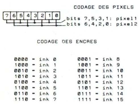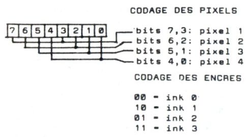 MÉMOIRE SUITE ET FINLe mois dernier, notre leçon s'est terminée par un point d'interrogation et, juste avant lui, une question en supens, restée sans réponse jusqu'à aujourd'hui. Cette question Comment les couleurs sont-elles codées dans un octet écran ? je m'en vais la dé-pendre à l'instant même et y répondre sans plus attendre, le supense devenant beaucoup trop insupportable. Commençons par le mode le plus facile, le mode 2 : MODE 2 : 8 pixels 2 couleursChaque bit code 1 pixel. Selon qu'il est à zéro ou à un, le point sera d'encre 0 ou d'encre 1. MODE 1 : 4 pixels 4 couleur2 bits codent 1 pixel de la manière suivante
