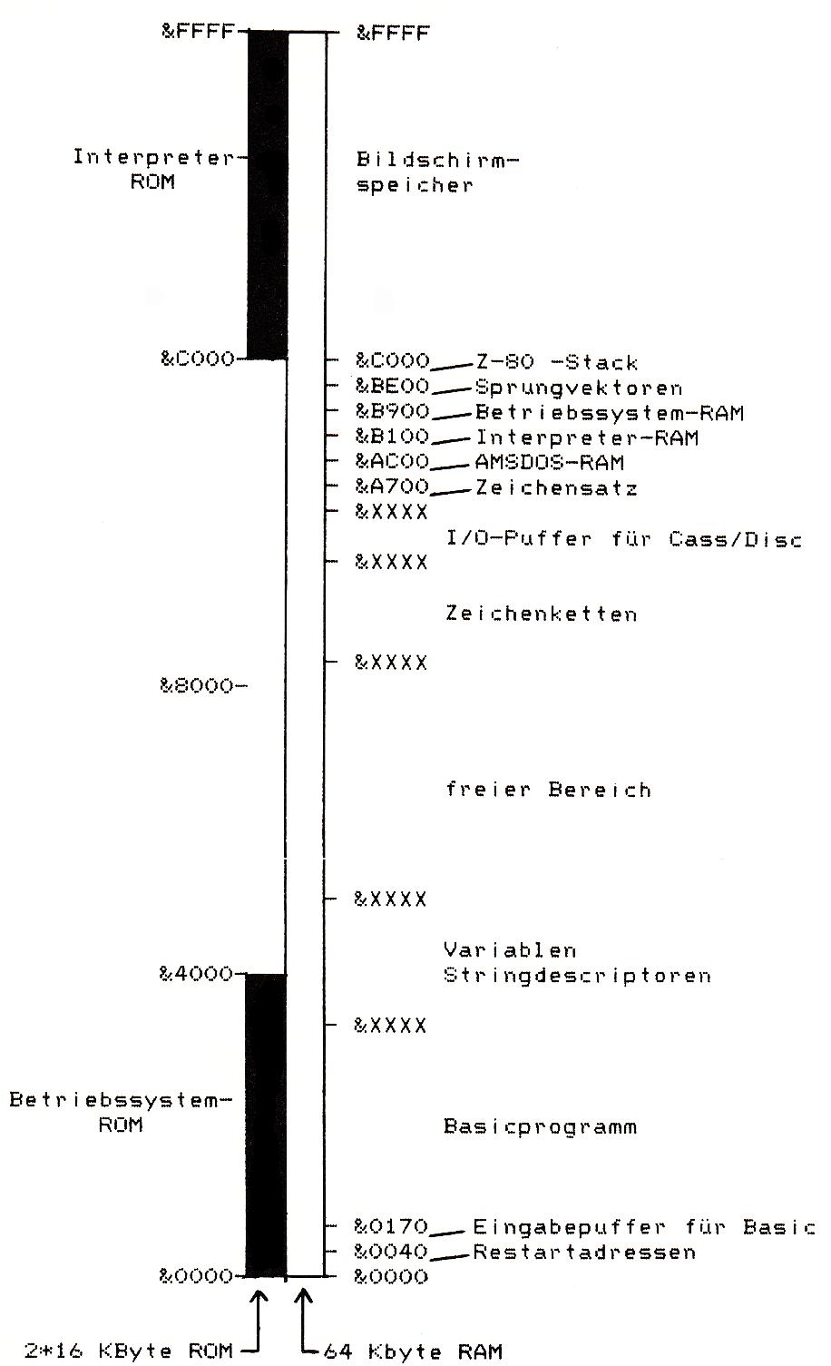 Allerdings kann es dabei passieren, daß sich der Punkt bereits im nächsten Bild-schirmbytc befindet. In diesem Falle wird bei der Rotation der Bitmaske auf der rechten Seite eine 1 herausfallen, was sich über das Carry-Flag testen Der langen Rede kurzer Sinn - so sieht die Sequenz aus: RRC C Bitmaske nach rechts rotieren Die Verschiebung nach links funktioniert ebenso, indem der Befehl RLC ("Rotiere links”) benutzt wird und notfalls die Systemroutine SCR PRE-V'IOUS BYTE in Aktion tritt. So abstrakt diese Vorgänge auch sein mögen-ganz nebenbei hat sich hierein weiteres Problem von selbst erledigt. Da der aktuelle MODE in der Struktur der Bitmaske bereits impliziert enthalten ist, brauchen wir uns darum keine weiteren Gedanken mehr zu machen - unser System funktioniert in jedem Fall! Wie man sich in x-Richtung bitweise durch den Bildschirmspcicher bewegt, wäre damit klar, aber was ist mit der y-Richtung? Diese Frage läßt sich in einem Satz beantworten: Wir benutzen einfach die Systemroutinen SCR PREVIOUS LINE und SCR NEXT LINE, die die Bildschirmadresse um eine Position nach oben bzw. unten weilerrechnen, und damit hat sich's. Ohne Zweifel - es kommt Land in Sicht. Die ersten beiden Punkte auf unserer Problemliste (Arbeitsgeschwindigkeit, Abhängigkeit vom MODE) können wir bereits provisorisch abhaken, und es bleibt nur noch Punkt 3: Wohin mit der Unmenge von Eckpunktkoordinaten, die eine FILL-Routine mitunter produziert? Daraus ergibt sich eine weitere Gelegenheit, etwas über professionelle Programmiertechnik zu lernen. Können Sie etwas mit dem Begriff »dynamische Speicherverwaltung« anfangen? Falls nicht, hier eine kurze Erklärung: Eine dynamische Speicherverwaltung ist immer dann von Vorteil, wenn größere Datenmengen mit sehr unterschiedlichen Eigenschaften verwaltet werden müssen. So hat es zum Beispiel der Basic-Interpreter des CPC nicht nur mit Programmen zu tun, sondern auch mit verschiedenen Variablentypen (Real, Integer, String). Dazu kommt noch der Zeichensatz, die Ein- und Ausgabepuffer für Kassette/Diskette... und alles muß irgendwo untergebracht werden. Bei einer statischen Verwaltung wird der Speicher von vornherein fest aufgeteilt, indem zum Beispiel 20KByte für Programme reserviert werden, und wenn die voll sind, heißt es eben »Memory full«, auch wenn im Variablenbereich noch gähnende Leere herrscht. Da der Speicherbedarf der FILL-Routine von Fall zu Fall sehr verschieden sein kann und die Daten auch nui kurzfristig gespeichert werden brauchen, ist es also unsinnig, dafür einen Bereich ständig reserviert zu halten. In unserei Basic-Version hatten wir allerdings kaum eine andere Wahl, als uns mit dei DIM-Anweisung auf eine bestimmte Arraygröße festzulegcn. In Assembler besteht jedoch die Möglichkeit, die FILL-Routine in die bereits vorhandene dynamische Speicherverwaltung des Interpreters einzubinden - soll der sich mal darum kümmern, wo die, im Extrem-fall benötigten, 20KByte noch hinpassen! Die Speicheraufteilung des CPC Bevor wir dieses Projekt in Angriff nehmen, sollten Sie sich jedoch einen Gesamtüberblick über die Speicheraufteilung des CPC verschaffen. Alle wichtigen Speicherbereiche haben wir deshalb in einem Diagramm zusammengcstellt. Die mit &XXXX gekennzeichneten Grenzen sind variabel, werden also vom Interpreter nach Bedarf gesetzt. Auffallend ist dabei, daß ein Teil des Adressbereiches doppelt genutzt wird. Die unteren 16KByte werden zusätzlich vom Betriebssystem-ROM belegt, und die oberen 16KByte vom Basic-ROM. Solange es darum geht, etwas in den Speicher hineinzuschreiben, stellt die Überlagerung von RAM und ROM kein Problem dar - ein ROM (Read only Memory) kann nicht beschrieben werden. Anders verhält es sich jedoch, wenn in dem Bereich Daten gelesen oder Programme aufgerufen werden. In diesem Fall muß mit einem Umschaltmechanismus entschieden werden, ob eine ROM- oder eine RAM-Adresse gemeint ist. Angenommen, wir rufen von Basic aus mit CALL die FILL-Routine auf, so ist zu diesem Zeitpunkt im gesamten Adressbereich RAM selektiert; der direkte Zugriff auf Routinen im Betriebssystem- oder Interpreter-ROM ist also nicht ohne weiteres möglich. Zwar gibt es spezielle Einsprungvektoren ins Betriebssystem, die beim Aufruf automatisch die richtige Speicherkonfiguration wählen, doch sie haben einen kleinen Nachteil: Bei jedem Aufruf wird zwischen ROM und RAM umgeschaltet. Solange es nicht auf Höchstgeschwindigkeit ankommt, spielt diese kleine Verzögerung keine Rolle, aber bei unserer FILL-Routine würde sich das bereits bemerkbar machen. Hier bietet es sich also an. das Betriebssystem-ROM gleich zu Beginn »aufzuwecken« und dann in diesem Zustand zu belassen. Ein weiteres Problem stellt das Basic-ROM dar. Da wir es ja wegen der dynamischen Speicherverwaltung anzapfen wollen, müssen wir auch hier Mittel und Wege finden, den passenden ROM/RAM-Status einzuschalten. Allerdings gibt cs auch einen guten Grund, den direkten Zugriff auf die ROMs zu vermeiden, den wir hier nicht verschweigen wollen: Programme, die diese Technik benutzen, werden mit hoher Wahrscheinlichkeit nur auf dem CPC 464 laufen. Da der CPC 664/6128 aber ohnehin schon mit einer sehr guten FILL-Routine gesegnet ist, brauchen wir uns in diesem Fall keine Hemmungen auferlegen. Will man die Auswahl des ROM/ RAM-Status in eigener Regie übernehmen, so ist es allerdings unumgänglich, sich mit einer sehr speziellen Gruppe von Z-80-Befehlen auseinanderzusetzen, den Restart-Befehlen. Es handelt sich dabei um Unterprogrammaufrufe. die nur zu ganz bestimmten Adressen verzweigen. Sie können sich darunter so eine Art GOSUB mit fest vorgegebener Zeilennummer vorstellen. Da die Zicladresse bereits in den Befehlen eingebaut ist (implizierte Adressierung). kann er durch ein einziges Byte codiert werden, was eine besonders schnelle Ausführung erlaubt - der Prozessor weiß halt sofort, wo es hingeht und braucht keine Adresse mehr zu lesen. Deshalb werden diese Befehle gerne b