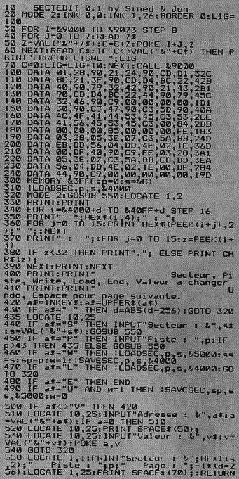 Dis, monsieur, c'est quoi un secteur ? Eh bien mon petit, il faut avant tout savoir qu'une disquette contient deux faces. Sur chaque face, environ quarante pistes sont disposées de façon concentrique. Sur chacune des ces pistes, environ neuf secteurs sont placés de manière régulière. Ce sont en fait des morceaux de piste, de taille égale, contenant chacun 512 octets. Entre ces secteurs viennent des identificateurs, mais cela dépasse quelque peu le cadre de ce petit article. Donc, dans le format Data utilisé sur CPC sous AmsDos. nous savons que nous pouvons loger, sans perdre de fiabilité, quarante-deux pistes, notées de 0 à 41, contenant chacune neuf secteurs notés de &C1 à &C9, renfermant chacun. encore, 512 octets. Petit calcul : 40 * 9 * 512 = 184 320 octets disponibles. Comment cela ? Si on divise cette valeur par 1 024, ce qui est le nombre d'octets par ko, on s'aperçoit que le nombre d'octets enregistrables sur un tel support est 180 ko. Pourquoi le nombre de ko libres après formatage est-il alors seulement de 178 ko ? 2 048 octets sont partis faire un petit tour aux fraises '.' Pas cool ! Mais non, ces deux ko sont simplement utilisés par l'AmsDos pour gérer les entrées de la Directorie. Soixante-quatre points d'entrée de 32 octets son! donc pris, sans nous demander notre avis, pour que le système sache où et comment sont disposés les fichiers sur la disquette. Nous verrons aussi plus tard à quoi correspondent les valeurs stockées dans cet endroit crucial d'une disquette AmsDos. Pour l'instant, ce qui nous intéresse, ce sont les RSX que l'on vous a préparés et gardés au chaud pendant quelque temps. MOUILLONS-NOUS AVEC LOADSEC ET SAVESEC La lecture d'un secteur n'est pas dangereuse, sauf si on s'amuse à aller chercher le deux cent cinquantième secteur de la deux mille quarante-troisième piste. A ce niveau, le lecteur se prendra pour une auto-mitrailleuse en manque de délires dévastateurs. Si on reste dans le domaine du logique et du convenable, tout se passera sans problèmes, et le lecteur se sentira fier de collaborer à l'analyse du support magnétique rais en cause. Par contre. pour ce qui concerne la sauvegarde de secteurs, il faut faire très attention. Ce genre de manœuvre peut en effet réduire à néant bon nombre d'heures de travail. Si. par exemple, vous sauvez n'importe quoi dans le secteur &C1 de la piste 0. vous écrasez la Directorie, et il devient alors difficile, voire impossible, de récupérer les fichiers perdus. C'est pour cela que je ne conseillerai jamais assez de faire des copies de disquettes, avant de faire une quelconque opération sur l'original ( il est d'ailleurs préférable de faire des modifications sur la copie ). Bon. cela dit, jetons-nous à l'eau, mouillons-nous, et utilisons le mini-éditeur de secteur de ce mois.