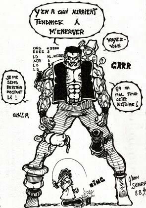 Dans la liste ci-dessus, d est un déplacement signé sur un octet, n une valeur entre zéro et deux cent cinquante-cinq, r un registre simple, et rr un registre double. Pour ces opérations concernant l'accumulateur, tous les drapeaux indicateurs d'état du registre F sont influencés. Par contre, en ce qui concerne les opérations sur les registres seize bits, seul l'indicateur de débordement (C la retenue) témoigne d'une éventuelle erreur. Voilà, tout est dit pour ADD, passons donc à SUB. Cette instruction est au niveau en dessous d'ADD car elle ne permet de faire des opérations que sur I accumulateur. Il est donc possible de soustraire de A un registre huit bits, une valeur immédiate, le contenu de l'adresse pointée par HL. par K+d ou encore par fY+d. Tous les drapeaux sont positionnes en fonction du résultat, ce qui permet de faire les travaux nécessaires à la suite du programme sans galipettes périlleuses. Comme vous l'avez vu, ces opérations ne prennent aucun drapeau en compte, et les opérations se ton! bêtement. La syntaxe à utiliser avec cette instruction n'est pas la même que celle utilisée pour ADD. Etant donné que l'opérande de destination est toujours l'accumulateur, il n'est pas nécessaire de le préciser. Les assembleurs comprennent donc la simple commande suivante : SUB opérande Les mêmes instructions existent aussi, mais tiennent compte de la retenue, ce qui permet de faire des calculs plus performants. ADC (addition witb carry) et SBC (substraction with carry) permettent de faire des opérations sans négliger la retenue, ce qui est très utile lors de calculs entre des valeurs codées sur huit et seize bits. Voici une petite routine qui appuie mes dires : 8 ; Addition de HL avec A et stockage dans HL ADD A,L ; Addition des deux poids faibles. LD L,A ; Stockage dans L. LD A,H ; Chargement du poids fort. ADC A,0 ; Mise à jour du poids fort LD H,A ; Restoration du poids fort.Ou encore:ADD A.L ; Addition des deux poids faibles. LD L,A ; Stockage dans L. JR NC,PAS ; Saute l'instruction suivante. INC H ;Incrémente H si Carry PAS ...Cela permet donc d'additionner une valeur huit bits à une valeur seize bits, sans modifier un second registre double. Cela paraît insignifiant, au premier abord, mais il faut bien se dire que ce n'est pas parce que l'assembleur est rapide qu'il ne faut pas faire d'efforts. Toute optération faite avec la mémoire prend beaucoup plus de temps qu'une même opération exécutée dans le microprocesseur. De ce fait, il faut utiliser la mémoire le moins possible, et donc éviter tout PUSH, CALL, etc. Cela ne doit pas être fait au détriment de la structure du programme, quoique le gain de vitesse soit assez conséquent, lors de la programmation en ligne. Les types d'adressages possibles avec cette instruction sontADC A,(HL) ADC A,(IX+d) (0<=d<=255) ADC A,(IY+d) (0 < = d < = 255) ADC A,n (0<=n<=255) ADC A,r (r : A, B, C, D, E, H, L) ADC HL,rr (rr : BC, DE, HL, SP)Toutes ces opérations positionnent parfaitement tous les drapeaux, ce qui n'est pour déplaire à personne. Pour en finir avec ces quelques instructions, nous allons parler de SBC ( Zousblash !!! Ce fut le bruit provoqué par la baffe mise au chef par Sined, à la suite d'un jeu de mot idiot que nous ne citerons pas. Et puis si : non, c'est levé). SBC, comme ADC, fait appel à la retenue. SBC signifie substraction with carry. c'est-à-dire soustraction avec retenue. Cette instruction opère une soustraction du premier registre désigné avec l'opérande donnée et la retenue. Le résultat obtenu est stocké dans le premier registre donné et les drapeaux indicateurs sont positionnés en conséquence. Voici donc les instructions reconnues avec cette mnémonique.SBC A,(HL) SBC A,(IX+d) (0<=d<=255) SBC A,(IY+d) (0<=d<=255) SBC A,n (0<=n<=255) SBC A,r (r : A, B, C, D, E, H, L) SBC HL,rr (rr : BC, DE, HL, SP) Comme vous le voyez, cette instruction ressemble beaucoup à ADC et le même genre d'ennui arrive de la même manière. En effet, il arrive parfois qu'un dépassement de capacité fausse les résultats. Il faut donc faire attention, lors de vos calculs, à vérifier les drapeaux pour ne pas avoir de surprises. Comme nous avons beaucoup parlé de la retenue, il faut aussi savoir que certaines instructions servent à la forcer ou n la modifier.LA RETENUE Ah, la retenue ! Je me rappelle avoir passé de nombreuses heures de colle en retenue. Mes professeurs ne m'aimaient pas beaucoup, et. à l'école, le temps que je ne passais pas au coin, je le passais en heures de retenue. Par Krom. ce que j'ai pu maudire cette retenue. Maintenant, jai grandi, et je vénère ce que j'ai dû combattre autrefois. Cette retenue est en effet un des outils les plus importants du microprocesseur, et sans elle, nous serions considérablement coincés. Pour l'influencer, nous avons deux instructions, et même trois. Les deux premières sont simples et influencent directement la retenue. D'abord, nous avons SCF. c'est-à-dire set carry Flag, qui force la retenue à un, ce qui peut parfois servir. La seconde opération influençant directement la carry est CCF, qui complémente la retenue, comme son nom l'indique. Il faut bien faire attention et ne pas comprendre nettoyage de la retenue. Lors de l'utilisation de cette instruction, la carry devient simplement son opposé. Si elle valait un, elle devient zéro, et inversement vice versa le contraire. La troisième opération dont je vous ai parlé force la retenue à zéro, sans pour autant la concerner directement En effet OR A ne prend qu'un octet le minimum de place et de temps machine, et nettoie la retenue, sans modifier aucun registre. Voilà, je vous ai donné tous mes petits secrets a ce sujet OH MOI, VOUS SAVEZ Eh oui, vous le savez, au mois prochain, comme d'habitude. Mais avant de vous quitter, je vous donne une dernière opération que j'avais oubliée. NEG est une petite instruction qui fait simplement une soustraction à 0 de l'a