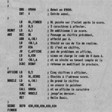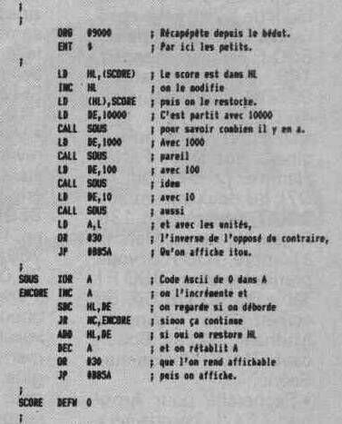 Programmer en assembleur n'est en fait pas compliqué. Tenez, un exemple concret. Voyez Alain Massoumipour, ce génie que nous apprécions tant et qui nous gâte mois après mois avec tous ses petits programmes plus énervants les uns que les autres. Il a été capable de programmer l'Ile tout en assembleur, après seulement un an d'expérience (pub : moi je l'achète ! Pupub). Qu'attendez-vous pour vous y mettre ? Il faut simplement et contrairement au Basic, faire l'effort de se plier aux contraintes de la machine. On doit, pour chaque opération à programmer, gratter, fouiller, décomposer, neutraliser et pulvériser tous les petits problèmes que l'on peut rencontrer. Rome ne s'est pas faite en un jour, et bien un programme ne se fait pas non plus en un jour. Prenez votre mal en patience et comprenez bien que tout le secret de l'assembleur réside dans la révélation de ses énigmes par ta machine. Lorsque vous aurez compris que programmer en assembleur n'est que jongler avec des octets, donc des valeurs de 0 à 255, plus rien ne sera difficile pour vous, si ce n'est la recherche de vitesse. Donc, ne vous en faites pas et , pour vous remonter le moral, sachez que tout vient à point à qui sait attendre ( pour les habitués de l'assembleur : tout adresse le pixel pour ceux qui détournent les interruptions ). Amen, et que le quartz soit avec vous ! ASCENDANTS DESCENDUS C'est fou ce que je peux me répéter ces temps-ci. Alors que cela continue de plus belle. Il faut, pour ceux qui ne l'auraient pas encore fait, que vous vous procuriez un livre sur les vecteurs systèmes du CPC. C'est obligatoire pour commencer. Il en existe des tonnes, de Clef pour CPC de chez PSI à la Bible du CPC de chez Micro Application, en passant par tous les autres, ce n'est pas ce qui manque. Une fois que vous avez fait l'acquisition de ce livre, vous pouvez vous attaquer à votre Z80, avec l'aide de votre assembleur, bien entendu. Cette fois, nous allons partir à la poursuite de l'affichage des scores. Cette bête se cache partout, dans tous les jeux, qu'Us soient d'arcade ou d'aventures. Alors taïaut, taillons-le en mnémoniques ! SCORES AROUND THE SCREEN Avant tout, il faut choisir le mode de stockage que l'on va utiliser. Le plus simple, bien entendu, est d'avoir le score en mémoire sous forme de caractères affichables. Dans ce cas, aucun problème ne se pose, il suffît de travailler sur les codes ASCII de &30 à &39 représentant respectivement les caractères de 0 à 9. Pour incrémenter et afficher un score, pas de problème. le cas est très simple (je vous conseille d'ailleurs ce genre de méthode dans vos jeux). Comme vous pouvez le voir dans le listing 1, la routine pour afficher un score est très courte et, de plus, assez rapide. Ce n'est pas, par contre, un exemple dans sa réalisation : elle est un peu antistructuration. M'enfin, on ne peut pas tout donner en même temps. Comme vous pouvez le remarquer, on procède comme si on comptait sur ses doigts. Les chiffres sont rangés dans le bon ordre et il est ainsi facile de les afficher. On commence par le dernier, auquel on ajoute obligatoirement un. Si, une fois l'incrémentation effectuée, le caractère est un chiffre, tout va bien. Sinon, on charge 1 dans l'accumulateur pour modifier le caractère suivant, et ainsi de suite jusqu'au cinquième. Cette routine est bien pensée : dans le cas où il n'y a pas de retenue, l'affichage se fait instantanément sans que l'on soit obligé de passer sur les cinq caractères. Il est en effet possible, dans ce cas, de sortir tout de suite de la boucle qui n'est là que pour s'assurer du non débordement des données sur le programme. Avec cette routine, on peut également additionner 10 ou 100 en modifiant B, ne contenant respectivement plus que 4 ou 3, et HL ne pointant pas sur FINSCO mais, encore respectivement, sur FINSCO-1 ou FINSCO-2. Si vous changez la ligne contenant LD A,#30 en SUB 10, vous pouvez rentrer par AUX avec u ne autre valeur dans A Ainsi additionner 20, 3 ou 600 ne pose pas de problèmes. Voilà une bonne démonstration sur l'art et ta manière de trouver le meilleur codage des données en fonction de leur utilisation. Mais, comme je l'ai déjà dit. cette forme de travail est très simple. Imaginons maintenant une situation légèrement plus complexe (mais je me soigne). OH CATARINETTA-BELLAMISSIX, ÇA SE CORSE Le problème consiste à transformer une valeur codée sur 16 bits (de 0 à 65 535) en caractères affichables, et en décimal de surcroît Pas simple, hein ? Bon, je compte jusqu'à dix pour vous laisser le temps de réfléchir. FOR I=1 TO 10:NEXT. Ca y est ! Pas de réponses ? Très bien, alors voici la solution au problème que nous allons décomposer ensemble. Pour passer d'une valeur quelconque à une suite de caractères affichables en base dix. bien des solutions se présentent En voici une qui est des plus simples à comprendre. Il faut décomposer le nombre en une suite de multiples de dix, du plus grand vers le plus petit, de manière logique. Lisez ceci, prenez petit papier et petit crayon et vous verrez que cela marche. Passons sans plus attendre à l'action (anticalcaire). Comment savoir combien il y a de fois 10 000 dans notre nombre ? Pour cela, on lui soustrait 10 000 jusqu'à ce qu'il y ait débordement et que l'on passe sous zéro. Pendant ce temps, à chaque soustraction, nous incrémenterons un registre contenant, à ta fin, le nombre de dizaines de mille qu'il suffira de convertir en caractères affichables en lui additionnant 48, soit &30, soit encore le code ASCII du zéro. On procédera ensuite de la même manière pour les milliers, les centaines, les dizaines, et enfin les unités qui couleront alors de source. Mais trêve de niaises causeries et passons au listing 2. Comme vous pouvez le remarquer, c'est aussi simple de le dire que de le programmer. Nous avons utilisé un sous-programme pour ne pas avoir à écrire cent fois la même routine ser