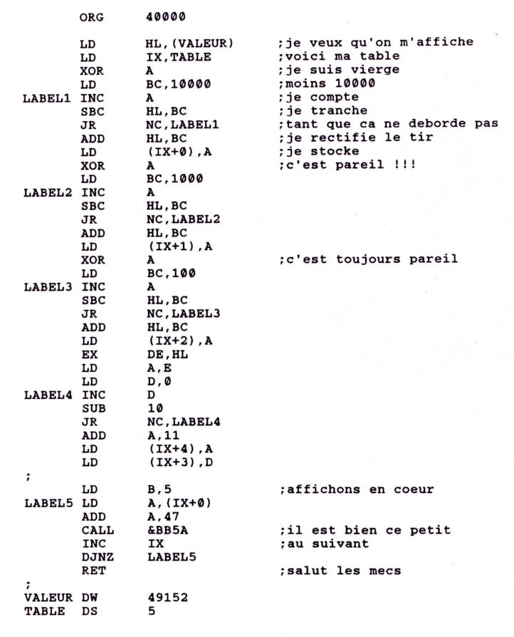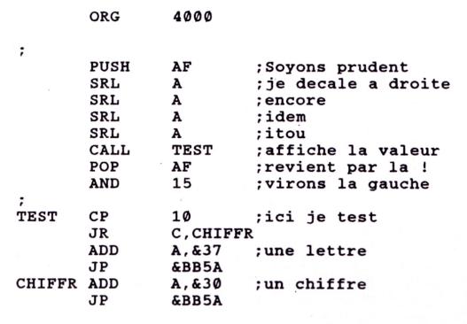 AFFICHE-MOI UN OCTET A Cent Pour Cent, on ne fait pas les choses à moitié. Non seulement on vous donne la routine pour afficher la valeur d'un octet en hexa (idée de CACH), mais en plus on vous donne une routine pour afficher deux octets, en décimal, cette fois. Si vous n'êtes pas de gros fainéants, il vous sera très facile de l'adapter pour la faire travailler sur un octet seulement. (Là, on remercie Yves Lamoureux.) JE CACHE A DROITE, JE CACHE A GAUCHE Pour les quelques rigolos qui pensent qu'il suffit de pointer l'accumulateur sur l'octet en question et d'envoyer la sauce par le vecteur BB5A je dirais qu'il ne s'agit pas de l'affichage Ascii d'un octet mais bel et bien de la valeur qu'il contient. Par exemple, si un octet est chargé avec la valeur 123, on veut que notre routine affiche cette valeur, c'est-à-dire 1 suivi de 2 suivi enfin du 3, compris ? L'idée première est l'affichage en hexadécimal. Il est vrai que c'est un casse-tête plus simple à résoudre que l'affichage décimal. Alors, suivez le guide. La valeur à afficher est dans l'accu. On sauve par un PUSH cette valeur, car la suite va modifier le contenu de l'accu qui doit nous servir plus tard. Quatre rotations à gauche en plantant un zéro à chaque fois dans le septième bit (c'est elle, c'est l'instruction SLR A), et voilà que les quatre bits de gauche se trouvent dans les quatre premiers bits de l'accu. Une petite routine nommée TEST compare la valeur de l'accu à 10. Si cette valeur est supérieure à 10, il faudra afficher une lettre allant de A à F, donc additionner à l'accu la valeur &37 avant l'utilisation du vecteur BB5A Dans le cas contraire, si la valeur est inférieure à 10, on ajoute tout simplement à l'accu &30 pour transformer la valeur en code Ascii représentant un chiffre (de 0 à 9). Une fois les quatre bits de gauche affichés, on récupéré la valeur initiale, on masque les quatre bits de gauche, et rebelote. Avouez que plus simple que ça, on meurt. VOUS POUVEZ LES FAIRE UN PEU PLUS LONGS ? Dans la deuxième routine, c'est moins évident. On tranche des valeurs de 10000, 1000, 100 et 10 en comptant à chaque fois le nombre de valeurs retranchées. On pointe le registre IX sur une zone de cinq octets qui contiendra en sortie les valeurs allant de 1 à 10 représentant les unités, dizaines, centaines, milliers, et dix millièmes. La valeur à afficher se trouve dans le double registre HL. Regardez, les opérations se ressemblent toutes. On annule la valeur de l'accu (XOR A, qui revient à LD A0 en plus beau), on met dans le registre BC la valeur à retrancher. Et puis, comme un grand, on compte jusqu'au débordement. On arrête tout et, pour remettre les choses en place, on ajoute la dernière valeur retranchée. Cela est répété plusieurs fois, avec la seule différence que le résultat est mis dans les cinq octets pointés par IX, qui peut être indexé comme nous le savons tous. ET QU'A QUOI QUE CA SERT ? Il faut vraiment être trop bête pour faire ce genre d'intertitre. Primo, cela comble une lacune du CPC, qui ne savait pas le faire ; deuxio, ça va encore plus vite que l'affichage Basic. Si, si essayez ceci : “A%=23516:T=TIME:PRINT A%: PRINT TIME-T”ensuite après avoir assemblé le deuxième source, essayez“T=TIME:CALL 40000: PRINT TIME-T”Si vous n'êtes pas convaincu, je baisse les bras, car vous êtes dans un cas désespéré.Il me semble inutile de vous faire des remarques sur les dernières lignes qui ne font qu'afficher une suite d'octets. Pour la modification des deux routines, vous allez un peu travailler. On ne va pas mâcher tout le boulot à votre place, non mais ! Zède, qui ne compte plus, A100% n°20