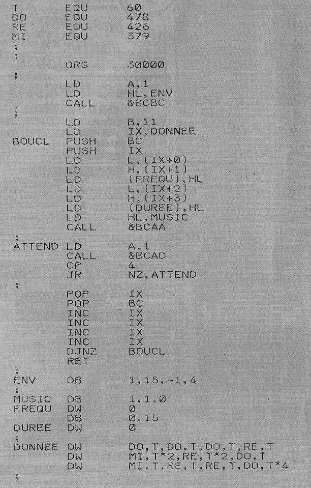 Mais, au juste, qu'attendez-vous ? Les routines pour afficher vos messages personnels Ion de la commande CAT ? Peut-être sont-ce les routines qui formateront vos disquettes à 42 pistes de 12 secteurs, soit 42*12*1024 octets ? Ah bon ? Laissez-moi deux secondes, j'y réfléchis. Ayé, yé sais ! Vous voulez faire de la zicmu en Assembleur (mais qu'est-ce qu'il est con çui-là : l'a pas vu le titre de la rubrique, là-haut. Non mais. Bip son and sound c'est quoi, alors ? Du Gainsbourg ? Ou de l'Equinoxe peut-être ? LA MUSIQUE Je suis entièrement d'accord. On ne peut improviser la musique, même si l'on s'appelle Miles Davis. Ne vous affolez pas, il ne s'agit absolument pas de vous balancer des cours de solfège, mais les notions élémentaires sur le principe de la SAO (son assisté par ordinateur). Il existe un bon paquet d'ordinateurs, genre pro (appelés vulgairement PC et compatibles) qui par défaut ne peuvent qu'émettre un vulgaire Bip sonore équivalent de notre PRINT CHR$(7). D'autres, comme nos CPC chéris, sont dotés d'un processeur sonore AY-8912. que l'on vénérera sous l'appellation de PSG (pour les ceusses qui ne comprennent rien à rien, sachez que cela n'a aucun rapport avec l'équipe de foot parisienne). Son rôle est simple. Il est capable de jouer simultanément trois sons de fréquences différentes sur trois canaux séparés. En plus, sur un des trois canaux, vous pouvez placer un bruit blanc (Noise en anglais, ce qui donnera les bruits de la mer, vent, hélico...). Les sons émis de la sorte sur le PSG, sont d'une pauvreté déconcertante. C'EST AINSI, QU'UN BEAU MATIN D'AOUT... Où notre soleil brillait de son plein éclat sur la ville de Londres et sa banlieue, et que les oiseaux heureux de vivre un tel bonheur chantaient leurs plus beaux récitals en Fa majeur. C'est ainsi, disais-je, que les programmeurs de la firme Amstrad, décidèrent de mettre au point un programme capable d'améliorer considérablement la qualité sonore de ce minable AY-8912. LE SYSTEME FUT L'idée était toute bête. Faciliter l'accès aux commandes du PSG (à travers les vecteurs système et le Basic) et pour enrichir les sons, modifier sous interruption les volumes ainsi que les fréquences émises sur les canaux. Prenons les choses une par une. Pour mieux comprendre les routines système sonore, faisons un peu de Sicba. SOUND Chaque son est joué sur un canal, ce sont les canaux 1, 2 et 4 ( 2^0,2^1, 2^2 ). On détermine la fréquence désirée (0 à 4095 où 2^12-1), le volume (0 à 15), la durée du son (-32768 à 32767). Pour utiliser les possibilités sonores programmées par les développeurs Amstrad, on donnera les paramètres pour choisir les enveloppes de volume (1 à 15) et fréquence (1 à 15). On finit les paramètres sonores en balançant, si le Cœur vous en dit, la valeur désirée pour le bruit (0 à 31). Voilà donc en résumé la commande SOUND de votre machine. Si vous utilisez les enveloppes, faudra pt'être définir ces dernières. ENV pour les enveloppes de volume, et ENT pour les fréquences (16 paramètres maximum par enveloppe). Je ne vous apprends rien en vous disant que l'on peut tester à n'importe quel moment l'état des canaux sonores à l'aide de la commande SQ. Toutes ces possibilités sagement apprises avec le Basic, sont utilisables telles quelles en assembleur. — CALL &BCA7 - Il initialise le gestionnaire sonore. En arrêtant tous les sons et remettant les enveloppes à zéro. En deux mots, c'est comme si vous éteigniez et rallumiez votre CPC. — CALL &BCAA - C'est l'équivalent de la commande SOUND du Basic. Cela marche comme en Basic, à savoir, un son n'est pas joué immédiatement si son canal est déjà occupé (c'est le principe des queues sonores). Il attend gentiment son tour et passera dès que possible. Il va de soit que l'on pourra forcer son passage en mettant le bit 7 de son canal à 1 (si vous préférez, en ajoutant 128 au numéro du canal 1 devient 129, 2, 130, etc.). Le registre HL doit pointer dans les 32 Ko de Ram centrale (de &4000 à &C000) sur une zone de données qui n'est autre que les paramètres sonores de la commande SOUND mais dans un ordre différent. ORG 30000 LD HL,SON— &BCAD - Test l'état d'un des canaux. C'est l'équivalent de la commande SQ du Basic. Pour cela, avant l'appel il faut impérativement placer dans l'accu la valeur du canal désiré (1 pour le canal A, 2 pour le canal B et 4 pour le canal C). En sortie, ce même accu contient l'état du canal. A savoir, 4 s'il est vide, 132 si un son est dans la queue sonore, 131 si deux sons se trouvent dans la queue sonore, 130 s'il y en a 3, 129 pour 4 et 128 pour 5 sons qui signale la saturation du PSG. |
