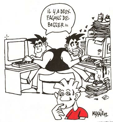 Cela est exactement du même acabit, saut que deux adresses au lieu d'une sont rencontrées sur la pile et que deux RET sont pareillement rencontrés par le programme. Si vous appelez cette routine trois fois par jour, cela n'est pas bien grave mais si c'est dix fois par seconde qu'elle est appelée, il vaut mieux faire attention aux bits qui traînent. Il en va de la rapidité du programme principal. On peut parfaitement se permettre de perdre du temps dans le corps d'un programme imposant si les routines souvent appelées sont écrites avec soin et précision. Voici maintenant les explications lignes par ligne de ladite routine. LD HL,VALEUR : remplit le registre HL avec la valeur à afficher. Je vous conseille de choisir une valeur entre 0 et 9999, la plus inédite possible et surtout n'importe laquelle de préférence (je vous propose tout de même de prendre 5781, ce qui est le tour détaille de Poum en dixième de millimètres!. PS ; pour le nombre de poils qu'il a dans le dos, le CPC ne possède pas encore de microprocesseur 256 bits : ENDPS, LD DE,1000 : nous allons commencer par comparer HL à 1000 ainsi qu'à ses multiples. CALL TRAITE : appel de la routine de traitement. LD DE,100 : idem pour cent, pour cent idem. CALL TRAITE: des vaches. LD DE,10 : que dire pour dix, idem itou. CALL TRAITE: des blanches. LD A,L : Lodaël, petite bourgade du sud de l'Iran où Poum a passé son enfance entre plage, coquillages et mer nacrée (NDPoum : Tout faux Sinoux, c'était le nord). Opération permettant aussi de récupérer dans A les unités restant encore dans le double registre HL. A ce stade, H est forcément neutre, comme au tour précédent mais pour des raisons de compacité, nous avons préféré ne pas le traiter à part. JR AFFICH : appel direct de la routine d'affichage car aucun traitement n'est utile, sortie théorique du programme car aucun retour n'est plus possible. TRAITE : label comme elle le mérite. XOR A : mise à 0 de l'accumulateur, CPL : mise à -1 de ce même registre par inversion de tous ses bits. Je ne sais pas ce qui est le plus rapide mais j'aime bien utiliser des trucs comme cela de temps en temps. CPL équivaut en fait à un XOR #FF, mais en plus court et avec le XOR A précédent, on arrive à un truc du type LD A,#FF ; mais en plus compliqué et moins lisible, histoire de brouiller les cartes. Je divague ("Vague?"). SOUSTR : ainsi parlait Sarah, label SBC HL,DE : si se baisser donne des courbatures, SBC permet de soustraire DE de HL. Dans ce cas, deux solutions. Si HL est toujours plus grand que zéro, il y va une fois 1000. Dans le cas contraire, il était trop petit pour jouer avec les grands. INC A : on incrémente A. Comme il valait -1, son premier passage le force à 0 et les suivants l'i ne ré mentant petit à petit. JR NC,SUBST : si HL était plus grand que zéro, la boucle est réexécutée. Dans le cas contraire, HL est maintenant négatif, ce qui nous oblige a ne plus le traiter. ADD HL,DE : comme HL est négatif, il nous faut le rétablir. Nous faisons cela en lui redonnant ce que nous lui avons pris de trop. Notez tout de même que l'accumulateur n'a pas besoin d'être modifié car il avait été préparé préalablement (chargé avec -1 donc possédant un tour de retard). AFFICH : label, label AFFICH. OR #30 : c'est la forme de conversion la plus simple pour passer d'un chiffre à son code Ascii, seulement si ce premier est inférieur à 10. JP #BB5A : appel de la ROM avec, en prime, retour au programme appelant, qui peut être un des CALL du programme ou simplement le programme ayant appelé tout ce machin. LES GRANDS REMEDES Comme vous l'avez vu, ce genre de programmation est assez tarabiscoté, voire burlesque. Pourquoi s'amuser à imbriquer des programmes qui s'appellent les uns les autres pour finir par la sous-routine qui n'est en fait que partie du programme lui-même ? Pourquoi tant d'allées et venues alors que ce code aurait pu simplement être linéaire, donc plus rapide, donc plus mieux en plus ? Là encore, je ne vous conseille que de bien penser à votre programme. Si des passages ont besoin d'être rapides et que vous ne manquez pas de place, pourquoi ne pas développer ceux-ci et perdre quelques octets au profit de la vitesse ? Prenez votre temps, travaillez sur papier, économisez votre clavier, pensez et votre programme en découlera de lui-même, comme la lave d'un volcan, comme un bouquet d'oiseaux qui s'enfuit au cri de l'arsenal du chasseur. On ne saurait jamais trop vous conseiller de tourner 2 562 145 102 fols votre langue dans votre bouche avant de dire des bêtises. Faites de même en programmation. LES CURES DE DÉTENTE Pour que tout cela entre définitivement dans vos jolis cerveaux déjà endoloris pas tant de mots puérils, je vous propose un exercice de style (voilà une phrase habile). Ajoutez à cette routine un petit passage permettant de ne pas imprimer de caractères zéros à gauche du nombre. Débrouillez-vous pour remplacer ceux-ci par des espaces. Puis, si le Cœur vous en dit, remplacez ces espaces par du vide, histoire de formater à gauche la valeur affichée. Il va sans dire que cela ne sera pas sans ajouter quelques lignes de code et quelques variables de travail. Je vous en laisse le soin. PASSAGE EN PUISSANCE Nous avons fait un affichage de score au demeurant très propre, mais le type de données de départ nous a un peu trop forcé la main. Sachez que le coding, art de choisir la manière dont seront organisées les données, est primordial dans le déroulement des programmes. Imaginez que nous décidions de stocker notre score en tant que chaîne de caractères. Son traitement en deviendrait du type : LD HL,FINNB PRECED DEC HL LD A,(HL) INC A LD (HL),A CP #3A JR NZ,AFFICH LD (HL),#30 JR PRECED AFFICH LD HL,DEBNB LODCAR LD A,(HL) OR A RET Z CALL #BB5A INC HL JR LODCAR