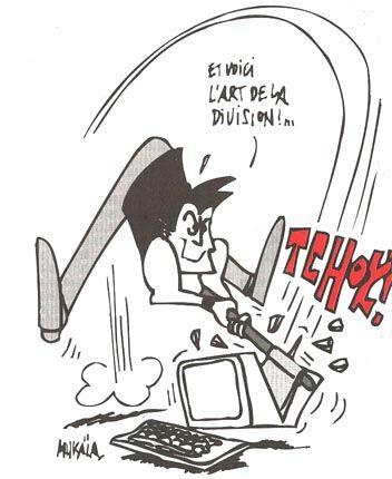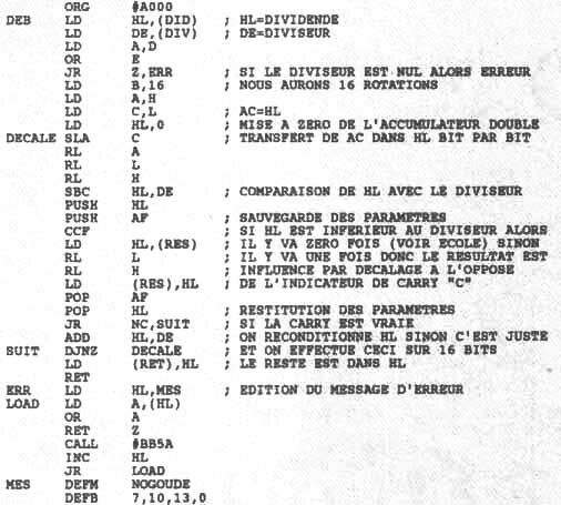 HL contient le résultat, DE l'opérande et A le multiplicateur. En TSTACCU, nous pesons le bit de droite et influençons éventuellement le résultat. En PASADD, nous décalons l'opérande à gauche pour le faire monter d'une puissance et nous testons enfin le multiplicateur pour vérifier qu'il est bien différent de zéro. DIVISER POUR MIEUX REGNER Le fait de programmer la multiplication nous a permis d'entrevoir un principe fondamental du langage machine. Lorsque nous programmons en base 2, toute opération arithmétique n utilisera que des additions à un niveau puisqu'un bit ne peut représenter que zéro ou une seule fois une valeur quelconque DU LANGAGE AUX MACHINES Dans le cas précis de I'application de cette théorie à un microprocesseur, il n'y aura qu'une simple différence de manipulation des nombres. Au lieu de décaler le diviseur vers la gauche, c'est e dividende que nous décalerons à droite. Cela est simplement dû au fait que nous ne saurons pas où placer le diviseur alors que son compère se positionnera de lui-même. Voici donc le principe exprimé sous forme d'algorithme. Le dividende de travail est annulé pour être ensuite décalé. Nous décalons le dividende de travail à gauche en y faisant glisser un bit du dividende réel. Nous soustrayons le diviseur au dividende de travail. Si la retenue est positionnée, cela signifie que le diviseur est plus grand que le dividende et il y va donc zéro fois. Dans le cas contraire, il y va une fois. Nous décalons donc l'inverse de la retenue dans le résultat. S'il y allait zéro fois, alors nous restituerions le dividende de travail. Lorsque nous effectuons ces opérations seize fois (il y a seize bits dans un mot machine), nous arrivons à réaliser une division binaire. Le reste de la division, soit son modulo, est dans le dividende de travail. EXTRAPOLATIONS PROGRAMMEES L'algorithme exposé ci-dessus, si vous le programmez, n'est pas bien compliqué à comprendre. Il fonctionne parfaitement sur le papier. Seulement voilà, il utilise un grand nombre de registres seize bits. Il nous faudra donc nous servir de zones temporaires que nous nommerons variables mémoires. Prenons notre exemple, qui peut être grandement amélioré dans la programmation, mais peu dans le principe. Les registres théoriques de travail sont organisés comme suit HL est le dividende de travail, DE est le diviseur et AC est le dividende réel. B nous sert simplement de compteur permettant de réaliser seize fois la boucle. Il est certain que nous aurions pu utiliser les doubles registres IX et IY, mais nous vous laissons le choix de parfaire cette routine comme bon vous semble. Au regard des explications exposées ci-dessus, la compréhension du listing accompagné de ses remarques n'est pas bien compliquée. DECALE force le décalage du dividende réel dans celui de travail et suit ensuite la modification du résultat selon le principe de l'inverse de la retenue. Tracez la routine et vous comprendrez mieux qui se passe. Notez que vous devrez regarder les nombres en binaire et non en hexadécimal, sans quoi toutes vos réflexions seront vouées à l'échec. LE BIT VOUS ACCOMPAGNE Sacrée programmation binaire. Il va sans dire que ce type de réflexion prend un peu le chou mais le résultat est là tout se fait tout seul. Décalages, retenues et j'en passe, sont les mamelles de la programmation en assembleur. Alors tétons en cœur... Sined multiviseur, ACPC n°46 jan93 , page 26-27
