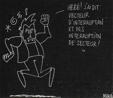 En voiture Thor, et sans tarder.. BCD7 : initialisation et déposé d'un bloc d'événement dans la liste de ceux a activer lors d'une interruption en provenance du CRT . Lorsque vous appelez ce vecteur, il met tout en ordre pour que la routine citée soit appelée a chaque fois qu'il est possible. CA: contient l'adresse du bloc d'événement ; B contient la classe de l'événement; C contient l'adresse de sélection de la Rom; DE contient l'adresse de la routine a insérer dans la file des événements temporises. CF: AF, DE et HL modifies. . BCDA: déposé d'un bloc d'événement dans la liste de ceux a activer lors d'une interruption en provenance du CRT Comme il est possible d enlever un bloc d'événement dans la file d'attente avec le vecteur suivant, il est possible de le remettre avec celui-ci. CA : HL Contient l'adresse du bloc d'événement; CF : AF, DE et HL modifies. . BCDD : enlève un bloc d'événement de la liste de ceux a activer lors d'une interruption en provenance du CRT Voir la légende du vecteur précédent CA : HL contient l'adresse du bloc d'événement ; CF : AF, DE et HL modifies. . BCE0 : initialisation et dépose d'un bloc d'événement dans la liste de ceux a activer lors d'une interruption rapide (tous les 1/300' seconde) S'il te plaît, monsieur le système, peux-tu me lancer cette routine 300 fois par seconde ? Pas de problème Batman, on y va... CA: HL contient l'adresse du bloc d'événement; B contient la classe de l'événement; C contient l'adresse de sélection de la Rom; DE contient l'adresse de la routine a insérer dans la file des événements temporises. CF : AF, DE et HL modifies . BCE3 : pose d'un bloc d'événement dans la liste de ceux a activer lors d'une interruption rapide Le même vecteur que &BCDA mais pour les interruptions rapides. CA: HL contient l'adresse du bloc d'événement CF : AF, DE et HL modifies. . BCE6 : enlevé un bloc d'événement de la liste de ceux à activer lors d'une interruption rapide Comme &BCDD mais pour les interruptions au 1 /300' CA: HL contient l'adresse du bloc d'événement CF: AF, DE et HL modifies. . BCE9 : dépose simple d'un bloc d'événement dans la liste de ceux il activer lors d'une interruption normale (tous les 1/50' seconde) Attention! ici le bloc d'événement n'est pas initialise. Il faut utiliser le vecteur BCEF pour cela. CA: HL contient l'adresse du bloc d'événement; DE contient la valeur a installer dans le compteur ; BC contient la valeur de recharge de ce compteur lorsqu'il atteint la valeur O. CF : AF, BC, DE et HL modifies . BCEC : enlevé un bloc d'événement dans la liste de ceux à activer lors d'une interruption normale. Il est possible de suspendre le lancement de certaines routines lentes sans pour autant les enlever de la file d'attente. CA: HL contient l'adresse du bloc d'événement CF : si le bloc d'événement appartenait bien a la liste, la retenue est vraie et DE contient la valeur du compteur. Dans tous les cas, AF, DE et HL modifies. . BCEF : initialise un bloc d'événement de manière à ce qu'il soit gérable par les deux vecteurs precedents Installer un événement dans une liste, c'est bien mais encore faut-il que la zone de mémoire concernée soit réellement un bloc de contrôle. C'est ici que nous le créons. CA: HL contient l'adresse du bloc d'événement; B contient la classe de l'événement; C contient l'adresse de sélection de la Rom; DE contient l'adresse de la routine; CF: AF et DE sont modifies et HL contient l'adresse du bloc d'événement augmentee de 7 octets. . BCF2 : actionne un bloc d'événement Des compteurs sont mis en action lors des appels des interruptions. Le fait de passer par ce vecteur permet le lancement conditionnel de la routine tout en modifiant les compteurs et les priorités mis en œuvre. CA: HL contient l'adresse du bloc d'événement CF: les registres sauf IX et IY sont modifies en fonction de la routine appelée. .BCF5 : fait le ménage dans toutes les files d'attente d'événements temporises CA : rien a configurer. CF : AF et HL sont modifies. . BCF8 : détruit un événement en l'enlevant physiquement de la file d'attente CF : HL contient l'adresse du bloc d'événement. CA : AF, BC, DE et HL modifies. . BCFB: recherche de l'événement suivant a traiter Cela permet de savoir si des taches restent a remplir ou non. CA: rien à faire. CF: si une routine est trouvée, la retenue est vraie et HL contient l'adresse du bloc d'événement. De toute manière, AF, DE et HL sont modifies. . BCFE : traite un bloc d'événement Dans ce cas, le lancement de la routine associée au bloc n'est pas force. CA : HL contient l'adresse du bloc d'événement. CF : AF, BC, DE et HL modifies. . BD01 : termine le traitement d'un événement Permet de modifier les niveaux de priorité des événements vises. Le système réalise cette opération en fonction des priorités de tous les événements. . BD04 : interdiction des événements temporises normaux Les files d'attente d'événements ne sont plus scannées. CA: rien. CF: HL est modifie. . BD07 : réautorise les événements temporises conventionnels Quand on a utilise le vecteur précèdent. On peut inverser l'action avec celui-ci. CA: aucune. CF: HL est modifie. . BD0A : interdit un événement Ce vecteur permet de stopper l'action d'un événement sans pour autant perdre du temps avec la gestion de la file d'attente. CA: HL contient l'adresse de l'événement. CF: AF est modifie. . BD0D : donne le temps écoule en 1/300' de seconde depuis l'allumage du CPC CA: rien a prévoir. CF: DEHL forme le nombre demande sur 32 bits. Voila, il ne nous reste plus qu'a passer en revue l'interfaçage avec le matériel. Et c'en est fini des interruptions. Notez que pour posséder ces dernières, rien ne vaut le fait de les utiliser a fond et de les analyser au microscope. En attendant je m'interromps... Sined le Barbare tabac, ACPC n°47, avril 93, p38, 39