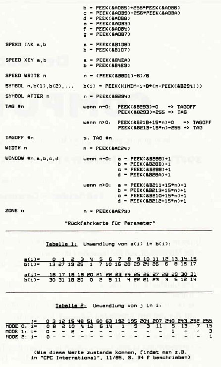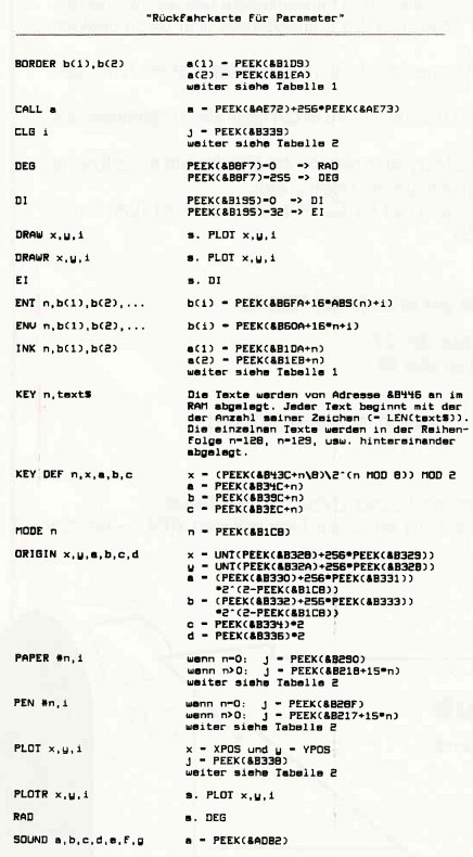 Wenn es um Parameter von Grafik, Sound usw. geht, zeigt sich der Rechner (zumindest von Basic aus) nicht sehr auskunftsfreudig: Man kann zwar (fast) alle Parameter mit Basic-Befehlen an den Rechner übergeben und einige wenige auf dieselbe Weise auch wieder zurückerhalten, die meisten jedoch verschwinden auf Nimmerwiedersehen im Rechner. Glücklicherweise werden sie aber (meistens unverändert) irgendwo im RAM abgelegt, damit das Betriebssystem sie dort bei Bedarf abrufen kann. Doch was dem Betriebssystem recht ist, kann dem User nur billig sein, und so holt er sich eben (mittels PEEK) alle die Parameter wieder zurück, die ihm das Basic sonst vorenthält. Wie, das soll die untenstehende Liste zeigen. Wenn Sie einmal etwas andere Werte zurückbekommen als Sie kurz zuvor eingegebenen haben, so sollte Sie das nicht wundern: Der Rechner überprüft und korrigiert natürlich alle Werte, bevor er sie im RAM ablegt. CPCAI 8608