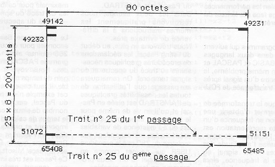 Fig. 2 LE CODAGE DES COULEURS En MODE 2, rien de plus simple : comme il n'y a que deux couleurs possibles, un bit 1 fait un pixel PEN, un bit 0 un pixel PAPER (Pixel est la contraction anglaise de PICTURAL ELEMENT). Lancez ce programme du listing n° 3 qui va dessiner en 0 et 1 les images binaires des quatre premiers caractères sur un écran en MODE 2. Le résultat est spectaculaire. On y retrouve les compositions illustrées dans le manuel AMSTRAD page A3.2 et suivantes. A présent, modifions la ligne 210 afin d'avoir MODE 1 (ou faites MODE 1 :RUN 220). Oh ! Que c'est vilain ! Sur chaque "pavé", on n'a qu'une moitié de chaque caractère. Il faudrait accoller les moitiés gauches des pavés pour reconstituer le texte. Les moitiés droites des pavés (ou des octets) ne comportent que des 0. Ces zéros constituent en fait le code couleur de PEN (PEN 1 en ce cas) : apparions - les gauche + droite, on a '01" quand il y a quelque chose à tracer, or &X01 = 1 (PEN 1). Tapons PEN 2 et, toujours en MODE 1, faisons RUN 220 : les 1 sont à droite et les zéros à gauche, &X10 = 2 (PEN 2). Tapons PEN 3 et même manœuvre. Dans chaque pavé, le demi caractère est répété à gauche et à droite, or &X11 =3. Puisque dans chaque octet on associe un bit de la moitié droite à un de la moitié gauche, il n'y a que quatre combinaisons possibles : "00" ( = 0) ; "01" ( = 1) "10" ( = 2) et "11" ( = 3) C'est pourquoi on n'a que quatre couleurs en MODE 1. Et que se passe-t-il sur l'écran vidéo ? Sur chaque image binaire d'un octet (le "tiret"), chaque bit 1 est doublé, et dans la couleur du PEN. Un caractère occupe donc deux pavés, et comme il y a 80 octets par ligne, cela fait bien 40 caractères par ligne d'écran. En MODE 0, c'est le même principe, mais en divisant par deux, un quart de caractère par pavé. Pour apparier les bits, on a alors 16 combinaisons possibles (les seize couleurs). A l'écran, chaque bit 1 est quadruplé dans la même couleur. LE HARD COPY D'ECRAN Il faut que votre imprimante possède l'instruction "BIT IMAGE", c'est le cas de la plupart des imprimantes "à aiguilles" ou "matricielles". En usage normal, une imprimante traduit l'octet reçu en dessinant le caractère ayant ce code ASCII, ici c'est beaucoup plus simpliste. Les huit aiguilles de la tête d'impression illustrent l'image binaire de cet octet. Ces dessins de bits vont être des "barres" verticales, or sur l'écran ils sont horizontaux ! Il suffit de tourner notre graphisme d'un quart de tour sur le papier. L'imprimante commencera par le bord vertical gauche en terminant par le bord droit de l'écran ; le bas de l'écran sera donc le long de la marge gauche du papier. Ce n'est pas gênant. L'auteur utilise une EPSON RX80 (les modèles FX ont les mêmes codes). Si la vôtre est d'une autre marque, il va falloir modifier les libellés des codes de commandes ; nous légenderons les nôtres afin que vous puissiez les traduire pour votre machine. Si vous trouvez les mêmes, ne soyez pas surpris car une bonne quinzaine de "marques" sont des EPSON rebaptisées. LEGENDES DES CODES EPSON CHR$f27);CHR$(64) = vide le buffer (initialisation) CHR$(27);"3";CHR$(24) = interlignes de 24/216 de pouce CHR$(27);"A";CHR$(8) = interlignes de 8/72 de pouce CHR$(15) = caractères condensés (17 par pouce) CHR$(27);"K" = mode bit-image LE PRINCIPE On explore des bandes verticales de l'écran de largeur 1 octet. Ces 200 octets sont mis en DIM Z puis ils sont retransmis à l'imprimante qui écrit donc une ligne. Passage à la colonne précédente et ainsi de suite. En jouant sur divers paramètres d'impression, nous sommes parvenus à restituer les proportions hauteur x largeur de l'écran (approximativement). En MODE 0, nous ne sommes pas (encore) parvenus à obtenir des dimensions d'image imprimées satisfaisantes, d'où l'absence de la version MODE 0. Très important : en MODE 1, les inscriptions doivent être en PEN 1 ou en PEN 3 (pas en PEN 2) car nous ne prenons que la moitié gauche des images binaires (ligne 55090). REMARQUE C'est aussi pour des raisons de proportions d'écran que les coordonnées graphiques sont de 640 x 400 alors que logiquement ce serait 640 x 200. CODAGE BINAIRE D'UN CARACTERE Vous voulez définir un caractère qui se trouve être un caractère existant mais légèrement modifié. Vous trouvez fastidieux de redessiner sa grille 8 x 8 et de totaliser toutes ces lignes. Alors, utilisez les programmes du listing n° 6 qui fait instantanément tout ce travail. Tapez indifféremment le caractère, s'il existe, au clavier ou son code ASCII. L'écran vous soumet sa fiche signalétique complète, à savoir : Le caractère, son code ASCII, sa configuration binaire en "1" et "0" et les totaux de chaque ligne. Exemple avec X majuscule : Code ASCII 88, codage 198, 108, 56, 56, 108, 198, 198, 0. Faites un autre essai en tapant 251. Ce programme refuse certains signes de ponctuation tels que + - , . &. En ce cas entrez le code ASCII.