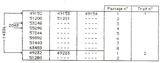 Extrait du livre "MIEUX PROGRAMMER SUR AMSTRAD"Les notions exposées dans cet article ne sont pas du tout indispensables pour devenir un bon progammeur en Basic ; elles permettent d'aller plus loin en triturant la zone mémoire de l'écran par des PEEK ou des POKE. Pour faire quoi ? Tout d'abord faire des programmes de "HARD COPY" qui exécutent sur imprimante une sorte de photocopie de l'écran en cours, surtout utile pour les graphismes (vous pourrez utiliser ces programmes même si vous ne comprenez pas leurs fonctionnements). Avec ces notions, et de la patience, vous pourrez aussi créer des effets colorés inaccessibles par les seules fonctions Basic. GENERALITES SUR LA MEMOIRE Le CPC 464, comme la plupart des micro-ordinateurs de moins de 20 000 FF, utilise un microprocesseur "8 bits" (un octet). Pour aller chercher un octet en mémoire, il faut que ce dernier ait une adresse. Un octet peut prendre 256 valeurs possibles (256 = 28). Pour les adresses, disons un octet pour les "colonnes" et un octet pour les "lignes" d'un "tableau d'adresses", donc 256x256 = 65536 "cases mémoire", qu'on numéroté de 0 à 65535. C'est ce qu'on appelle 64 k-octets car le "kilo-octet" vaut en réalité 1024 octets... Donc 64 k-o est le maximum pour un micro 8 bits. Il faut les partager entre la ROM (le Basic résident) et la RAM (programmes + variables en cours + les points lumineux envoyés à l'écran). Avec un Basic de 32 k-o, il ne resterait que 32 k-o pour la RAM, d'où vingt et quelques k-o disponibles pour programmes plus fichiers, c'est ce qui se passe avec les MSX et bien d'autres. Nous, nous avons 32 k-o de Basic, 43 k-o disponibles + 16 k-o réservés à l'écran ! La raison de ce "miracle" est que l'AMSTRAD "recharge et décharge" la portion de la ROM dont il a besoin (c'est une vue d'esprit). De ce fait, une large partie de la RAM est plutôt "mouvante", ce qui va donner bien du plaisir aux amateurs de PEEK et de POKE... La partie mémoire écran occupe une zone fixe, de 49152 à 65487, mais le fait que l'on puisse mélanger texte et graphisme, et ce en trois MODES, fait que sa structure est d'une extrême complexité inouie (même principe que sur les APPLE II, mais en pire). C'est ce qui explique que l'affichage des caractères est assez lent, exemple, quand on fait LIST sur un long programme. Dans le manuel, les adresses sont indiquées en hexadécimal (préfixe & et quatre caractères). Il est pratique de savoir faire les conversions hexadécimal-décimal dans les deux sens (Note : le préfixe hexadécimal ne signifie pas "six'-' mais "seize"). LES CONVERSIONS HEXA/DECIMAL/BINAIRE En binaire, on a deux symboles 1 et 0, en décimal on a dix symboles 0 à 9, en hexa on en a seize, 0 à 9 + A, B, C, D, E et F (&F=15;&A=10). On représente la valeur d'un octet par deux symboles hexa, ainsi &FA = (16 x 15) + 10 = 250. Il suffit de taper PRINT &FA et 250 apparaît à l'écran. De même, &FF = 255, c'est bien le maximum pour un octet. Une adresse tient sur deux octets, exemple &AFC8. Vous ne pouvez pas faire PRINT &AFC8 car l'AMSTRAD ne sait pas faire la conversion sur plus d'un octet, vous êtes obligé de décomposer : PRINT &AF*256 + &C8 et la réponse apparaît : 45000. L'opération inverse est beaucoup plus facile : PRINT HEX$(45000) l'écran répond AFC8 (le & est sous-entendu). Pour traduire une longue suite de valeurs hexa en décimal, vous gagnerez du temps en utilisant ce très court programme du listing n° 1. Passons à la représentation binaire d'un nombre. Tapez, par exemple : PRINT BIN$(45956), vous obtenez une suite de 16 bits 1 et 0. Essayez maintenant PRINT BIN$(3), vous obtenez "1" (c'est une chaîne) ; avec PRINT BIN$(3,16), vous avez 14 zéros suivis de "11 ". Gare à l'opération inverse par &X, elle traduit cette "image binaire" en un nombre dit entier, c'est-à-dire compris entre -327869 et + 32767 I Un zéro suvi de quinze 1 donne 32767, tandis que 1 suivi de quinze zéros donne -32768. Heureusement, vous n'avez pas à vous en préoccuper car dans la pratique les seules images binaires qui nous intéressent sont sur un octet, donc de 1 à 255. LE PLAN MEMOIRE DE L'ECRAN Nous y voilà ! Deux cent lignes horizontales de 80 octets chacune. Dans une ligne, les numéros d'octets se suivent de gauche à droite. Prenons le cas le plus simple, celui du MODE 2 : chaque bit représente un "pixel" ou point à l'écran, ainsi 255 fait un tiret continu (huit bits 1). La ligne en haut de l'écran va de 49152 à 49231, soit 80 x 8 = 640 points (ce qui explique qu'en coordonnées graphiques l'échelle horizontale aille de 1 à 640). Hélas, l'octet suivant, le 49232, n'est pas'au départ de la deuxième ligne mais huit lignes plus bas ! Et ainsi de suite au pas de 8 lignes. Après un premier "passage" de 25 lignes espacées de 8, commence le deuxième passages sur les lignes du dessous. Pour tout comprendre, essayez le programme du listing n° 2. Un joli store vénitien ! Les figures 1 et 2 vous donnent le plan des adresses d'écran. Vous constatez qu'entre deux "tirets" (deux octets) situés à l'écran, l'un en-dessous de l'autre, il y a un écart de 2048 octets ( = 2 k-octets), qu'entre deux lignes d'un même "passage" (donc espacées de 8 lignes d'écran), il y a un écart de 14336 octets. A présent, modifiez la ligne 110 en mettant MODE 1. Surprise ! Les traits sont rouges ( = PEN 3). En ligne 110, mettez MODE 0 : les traits clignotent en rose/bleu ciel ( = PEN 15). Nous abordons alors le code des couleurs en fonction du MODE.
