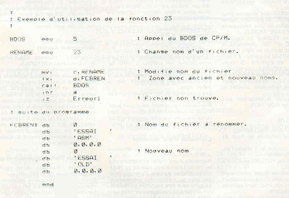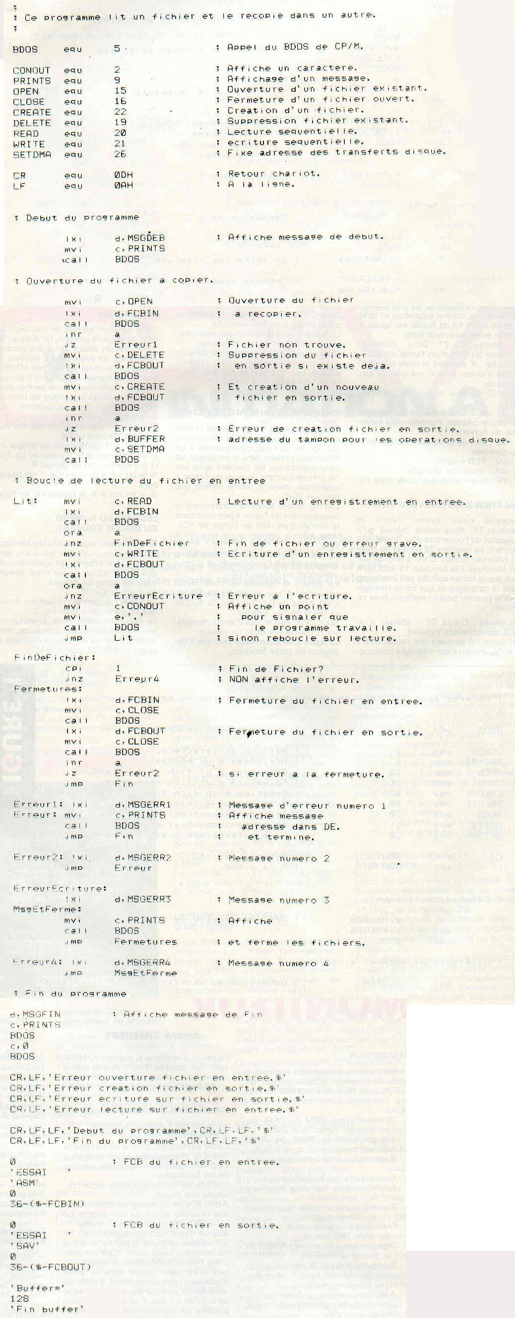 Nous allons voir ce mois-ci, dans la suite de notre étude des fonctions du BDOS de CP/M, les fonctions de lecture et écriture en mode séquentiel, plus quelques fonctions diverses. FIXATION DE L'ADRESSE DES TRANSFERTS DISQUE Afin d'expliciter le fonctionnement des fonctions de lecture et d'écriture, il nous faut parler de la fonction 26 qui permet de fixer l'adresse des transferts disque. En effet, lors d'une lecture séquentielle par exemple, CP/M va lire un secteur logique de 128 octets et le contenu de ce secteur sera mouvementé à l'adresse courante des transferts disque. Lors du démarrage de CP/M, cette adresse vaut 80H, mais la fonction 26 permet de fixer cette adresse de transfert où vous le désirez, c'est-à-dire le plus souvent dans une zone réservée à cet effet dans votre programme. Si cela est nécessaire, cette adresse peut être modifiée avant chaque lecture, pour charger un fichier en mémoire, par exemple, ou pour changer de zone de trans fert lorsque l'on passe d'un fichier à un autre dans un programme qui travaille sur plusieurs fichiers. Bien sûr, dès que votre programme se termine, CP/M réinitialise cette adresse à 80H. En entrée: C = 26 ; DE contient l'adresse des transferts disque à fixer. LECTURE SEQUENTIELLE D'UN FICHIER Cette fonction permet la lecture en séquentiel d'un fichier préalablement ouvert par la fonction 15. Rappelons que, pour CP/M, un fichier est un ensemble d'enregistrements logiques de 128 octets (un "secteur" CP/M). Donc, après la fonction 15 d'ouverture, le fichier est ouvert et le pointeur dans le fichier est fixé sur le premier enregistrement à lire. Chaque appel successif à la fonction 20 va donc lire 1 28 octets du fichier et les mouvementer à l'adresse fixée par la fonction 26 et déplacer le pointeur d'un enregistrement. En entrée: C = 20 DE = contient l'adresse d'un FCB d'un fichier ouvert. En sortie : A contient 0 si la lecture s'est effectuée sans erreur. En CP/M 2.2 une valeur différente de 0 signale que l'on a atteint la fin du fichier. En CP/M Plus les différentes valeurs possibles de A sont : – 01 : fin de fichier.ECRITURE SEQUENTIELLE D'UN FICHIER Cette fonction permet d'effectuer des écritures séquentielles dans un fichier préalablement ouvert, soit par la fonction 1 5. soit par la fonction 22. Après l'ouverture, le pointeur dans le fichier est fixé sur le premier enregistrement existant (fonction 15» ou à créer (fonction 22). Chaque appel successif à la fonction 21 va donc prendre les 128 octets se trouvant à l'adresse des transferts disque et les écrire dans le fichier concerné. Si le fichier était un fichier non vide et existant déjà, les écritures successives écrasent les anciennes données. Si on dépasse la fin du fichier tel qu'il existait à l'ouverture, celui-ci augmente en taille et la nouvelle fin de fichier est après le dernier enregistrement écrit. En entrée : C = 21 DE = contient l'adresse du FCB d'un fichier ouvert.Sous CP/M Plus les codes possibles sont : – 01 : plus de place dans le catalogue len cas de création d'une nouvelle extension du fichier).CREATION D'UN NOUVEAU FICHIER Lorsque nous avons décrit la fonction 15, nous avons précisé qu'il s'agissait de l'ouverture d'un fichier déjà existant. La fonction 22 permet de créer un nouveau fichier. C'est-à-dire qu'elle est identique à la fonction 1 5 sauf qu'il faut que le fichier spécifié soit inexistant dans le catalogue et que cette fonction crée le premier poste catalogue pour ce fichier. En entrée ; C = 22 DE- adresse d'un FCB correctement mitialisé. CHANGEMENT DU NOM D'UN FICHIER Cette fonction permet de changer le nom d'un fichier existant par un autre nom qui, lui, ne doit pas correspondre à un fichier déjà présent dans le catalogue. La zone pointée par DE contient dans ses 1 6 premiers octets, le nom du fichier à renommer, dans le même format que pour un FCB. Les 16 octets suivants contiennent le nouveau nom du fichier également dans le format d'un nom de fichier de FCB, mais avec le premier octet toujours à zéro. En entrée : C = 23 DE = adresse d'une zone contenant l'ancien nom et le nou veau nom en format FCB.LECTURE DU VECTEUR D'ETAT DES DISQUES Cette fonction permet de connaître les disques qui sont en ligne. Un disque "en ligne" est un disque qui a été accédé. Ainsi, dans un système à 2 lecteurs de disquette, si vous n'avez pas effectué d'accès au lecteur B :, celui-ci n'est pas en ligne. Cette fonction ne permet donc pas de connaître le nombre de lecteurs maxi possibles dans un système. En entrée : C -24LECTURE DU NUMERO DU DISQUE COURANT Cette fonction permet de connaître quel est le disque courant, c'est-à-dire celui sur lequel on effectue les opérations disque lorsqu'aucun disque n'est spécifié dans les noms de fichiers. En entrée ; C = 25 En sortie : A contient le numéro du disque courant. (A: = 0 B: = 1...) Le mois prochain, nous continuerons avec quelques fonctions diverses, mais surtout avec les lectures et écritures en accès RANDOM (accès relatif).