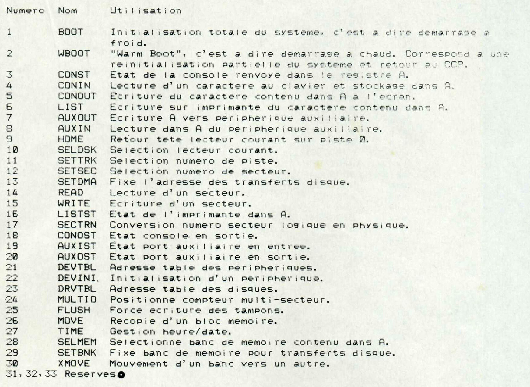 Nous voici donc arrivés à l'étude de la fonction 50, présente, rappelons-le, uniquement en CP/M Plus et destinée à un interfacage "propre" avec le BIOS. Le mécanisme d'appel est très simple et utilise une zone de travail qui contient les différents paramètres dont voici la description : – 1 octet : numéro de la fonction BIOS à rappeler – 1 octet : contenu du registre A à passer au BIOS – 2 octets : contenu du registre BC – 2 octets : contenu du registre DE – 2 octets : contenu du registre HL En entrée : C = 50 DE= adresse de la zone de travail contenant les paramètres. En sortie : A contient le code retour éventuel de la fonction BIOS. Mais quelles sont les fonctions BIOS ? La figure 1 vous donne la liste utilisant les abréviations standard des noms de ces fonctions. Notre propos n'est pas de vous les décrire toutes, car d'ailleurs la plupart ne sont que des appels aux périphériques permettant d'effectuer physiquement les fonctions du BDOS de CP/M. Figure 1: Les fonctions du Bios de CP/M Plus.