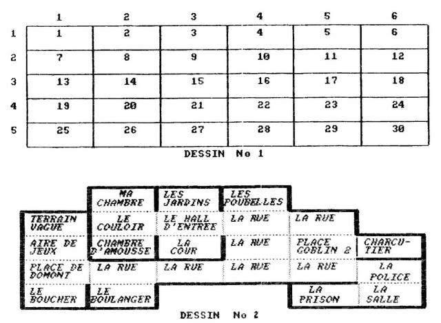 Tout ce que vous voulez savoir sur les jeux d'aventures, sans avoir jamais osé le demander, pour pouvoir vous-même en programmer un, quel que soit votre niveau de programmation.Vous avez bien lu, vous n'avez plus besoin de vous appeler Sined ou Rubi pour pouvoir écrire vos jeux d'aventures. Nous allons ensemble, pas à pas, étudier toutes les ficelles et astuces de programmation de ce type de jeux (graphismes à l'appui, s'il vous plaît...), à l'aide de petites routines maison, testées et approuvées par des milliers d'aventuriers à travers l'Hexagone. AVANT TOUT... En effet, durant plusieurs mois, nous verrons comment construire les plans des jeux, le traitement des déplacements et des objets, ainsi que leurs utilisations, les dialogues à travers un analyseur syntaxique, le traitement des images et leur stockage sur la disquette. Tout ceci de façon très souple, afin de permettre toutes modifications et améliorations de votre part. Ma conscience m'interdit de continuer à savourer le plaisir sadique de vous faire attendre. Donc, si vous le voulez bien, nous allons commencer. Et par quoi commence-t-on un jeu d'aventures ? Je vous le mets dans le mille..., par le SCENARIO, l'histoire, quoi ! Cela peut être un héros de l'an 3000 qui cherche à anéantir un tyran semant la terreur sur la galaxie, ou un jeune prince qui va à la recherche de Miss X pour la libérer des griffes du Chef... A vous de trouver l'histoire qui vous passionnera le plus. Faites travailler votre imagination et que la plus belle l'emporte. APRES TOUT... Personnellement, comme support à mes explications, j'utiliserai cette histoire terrifiante qui m'est arrivée il y a de cela trois semaines, quand mon ami poète et philosophe Amousse, qui avait la garde de mon chat Socrate, m'annonça la disparition de celui-ci. Cela m'entraîna à explorer tous les bouchers et charcutiers du quartier. Maintenant que vous avez tous une histoire, il faudra faire le plan de votre jeu. Attention, même si cela vous paraît simple, le plan doit être fait avec rigueur et discipline, tout comme les militaires (salut Robby et bienvenue au club à Michel du New Celtic Gang). Pour commencer, faites une grille comme sur le dessin n° 1 et notez les numéros des colonnes et rangées (dans cet exemple, il y a six colonnes et cinq rangées), puis numérotez les cases de gauche à droite en partant du haut. C'EST PAS TOUT... Nous prendrons comme convention que le Nord sera vers le haut et le Sud vers le bas (vous me suivez ?). Donc, l'Est sera à droite et l'Ouest à gauche. C'est dans les cases ainsi formées que va se déplacer votre héros, et ceci dans les quatre directions cardinales. Maintenant, dans ces mêmes cases, nous allons installer les lieux où se dérouleront les événements du jeu. Chaque case portera un nom ce qui nous permettra de nous y retrouver (voir le dessin n° 2). Attention, vous n'êtes pas obligé de remplir toutes les cases, et pour des raisons que l'on verra plus tard, je vous conseille de ne pas faire plus d'une trentaine de lieux.