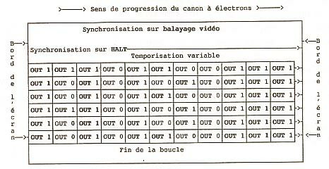 Les deux schémas que j'ai ajoutés à l'article sont seulement une représentation symbolique en fonction du temps, dans le deuxième schéma les instructions OUT 1 et OUT 0 n'existent pas en assembleur mais cela représente en fait le passage d'un pixel du split raster soit en couleur allumée soit en couleur éteinte (la couleur éteinte est la même que celle du fond, c'est logique) ; dans le schéma la disposition des OUT 0 et des OUT 1 est totalement arbitraire. Maintenant que nous sommes censés savoir représenter une lettre grâce à un split raster, il nous faut la faire bouger. ATTENTION SVP Le tout est de connaître ce qui conditionne la position du split raster par rapport au bord de l'écran; en fait, cela va dépendre de l'instant ou le split raster va être affiché en fontion de la position du canon à électrons. Plus clairement, on peut dire que cela dépend de la durée entre le HALT de synchronisation du split raster et le début du déroulement de la boucle d'instructions de changement de couleur. Donc, pour déplacer le split raster, il faut installer une temporisation variable avant d'exécuter la boucle composée des OUTs de changement de couleurs; cette temporisation variable va permettre selon sa durée (cette durée est exprimée en microseconde et est réalisée avec des NOPs) de positionner le split raster par rapport au bord du moniteur. Le petit exemple qui sert d'illustration pour cette partie de l'article est une routine qui réalise un quadrillage avec des .split rasters, et ce quadrillage donne l'impression de se déplacer en utilisant le principe de temporisation variable cité plus haut. Vous constaterez par vous-même que l'inconvénient des split rasters est qu'ils peuvent au minimum se déplacer à l'écran que de deux octets par deux octets (un changement de temporisation d'un NOP dans le programme donne un déplacement de deux octets à l'écran), ce qui explique pourquoi les scrolls en split raster sont si rapides et si fatigants pour les yeux. En conclusion, les scrolls en split raster c'est bien beau mais c'est à utiliser avec beaucoup de parcimonie et surtout à ne pas mettre en cas de scrolling racontant une longue et fatigante histoire, sinon personne ne regardera votre démo jusqu'a la fin, de peur d'avoir une conjonctivite et une tête comme une citrouille. Bon, je vais clore ici cet article et en promettant de ne plus vous embêter avec les rasters (au moins pas pendant un mois...).