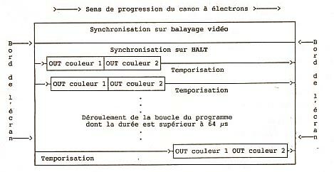 Comme convenu, nous allons continuer sur les rasters. Vous allez me dire que cela fait maintenant le troisième article à leur sujet: pour l'instant nous avons seulement vu la partie cachée de l'iceberg, car j'ai uniquement parlé de rasters lignes ou bien de split rasters simples, mais il me reste encore àvous parler des rasters dans plusieurs encres (impression de passage derrière puis devant un plan), rasters en diagonale, scrolling en split rasters, défilement d'un damier avec des rasters ( il suffit de regarder les démos allemandes pour voir de nombreuses utilisations de ces rasters). Au niveau de la programmation, les plus simples à réaliser sont les rasters en diagonale, car il s'agit en fait de simples split rasters dont la durée de synchronisation ligne est soit supérieure soit inférieure à 64 microsecondes. Le schéma 1 est la représentation symbolique du déroulement d'une routine de raster en diagonale. Dans notre programme d'exemple ( qui se trouve dans ces pages, enfin qui devrait s'y trouver... ), comme on désire faire une bande de couleur, il faut qu'elle soit encadrée de deux changement de couleur en noir. On peut donc déjà prévoir la durée totale des instructions contenues dans la boucle, à chaque changement de couleur on peut compter 4 microsecondes puisque chaque changement de couleur s'opère grâce a une instruction OUT; il faut en plus compter la gestion d'une variable qui servira de compteur de boucle ( la variable est sur 8 bits puisqu'on ne dépassera pas 256 lignes de rasters), donc il nous faut comptabiliser un DEC x ( décrémentation d'un registre 8 bits quelconque) après la mise à jour par le DEC de la variable. Il ne faut pas oublier de tester la condition de sortie de boucle et, si cette condition est fausse, de continuer la boucle, ce qui correspond à un saut conditionnel qui utilise 3 microsecondes. Dans l'exemple que j'ai choisi (j'ai encore mon mot à dire dans cet article: je choisis l'exemple que je veux, na ! ) il y a sept couleurs qui se succèdent dans le raster en diagonale, au nombre desquelles on doit ajouter le changement de couleur pour passer en noir, puis la mise à jour du regisye ainsi que le saut conditionnel, donc on obtient: 8 OUT + un DEC + 1 JP c'est-à-dire 8* 4+ 1 +3=36 microsecondes. Attention, car on ne doit pas se hâter pour en déduire la durée de temporisation pour la boucle, car dans notre exemple, et pour des raisons de facilité, je me suis servi des registres secondaires (j'espère que je n'ai pas à vous rappeler que ces registres sont accessibles en utilisant l'instruction EXX), ce qui nous oblige à ajouter encore deux microsecondes (puisque EXX en prend une seule mais qu'il y a deux EXX dans la boucle) et nous donne pour total 38 microsecondes.