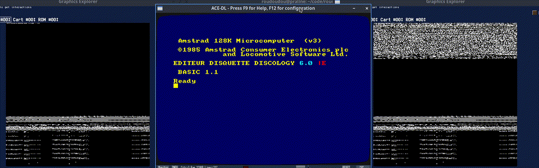 Que se passe-t'il au démarrage d'un Amstrad CPC/Plus?La première chose que fait l'ordinateur, c'est exécuter un programme situé en ROM. Dès la première microseconde après l'allumage, le Z80 va lire la mémoire morte (ROM) située à l'adresse zéro. Simple, basique. Le Gate Array qui s'occupe de filtrer la mémoire sélectionne la ROM basse par défaut, le processeur ne lit jamais la mémoire vive (RAM) au démarrage, et c'est heureux car elle peut contenir n'importe quoi! Dans l'animation ci-dessous, au ralentit, l'ordinateur redémarre. On voit à gauche le contenu de la mémoire vive uniquement. À droite, c'est ce que voit le Z80 "au travers" du Gate Array. On remarque une différence en haut, soit le premier 1/4 de la mémoire, plus précisemment la première page de 16K (16384 octets). Ce sont les données du programme BIOS (firmware+BASIC). Le Z80 exécute ce programme. Dans l'ordre, si vous regardez bien, plusieurs choses vont se passer. - D'abord des données sont copiées au tout début de la mémoire (tout en haut à gauche). Note : On voit qu'il reste de la mémoire non initialisée.Le Z80 est toujours en train d'exécuter un programme. C'est le firmware/BASIC. Il attend vos ordres. Et comme on le remarque sur le mapping visuel de ce que voit le processeur, sa ROM est connectéepresque en permanence, car c'est là qu'est localisé son programme principal, qui s'occupe de gérer les couleurs, les interruptions, le son, le clavier. L'autre chose importante est de savoir que vous ne disposez pas (depuis le Basic) de toute la mémoire disponible. Il y a quelques centaines d'octets au début de la mémoire et plusieurs kilo-octetssituées peu après la zone #A000 jusqu'en #C000 qui est l'adresse de début de la mémoire attribuée par défaut à l'écran vidéo.