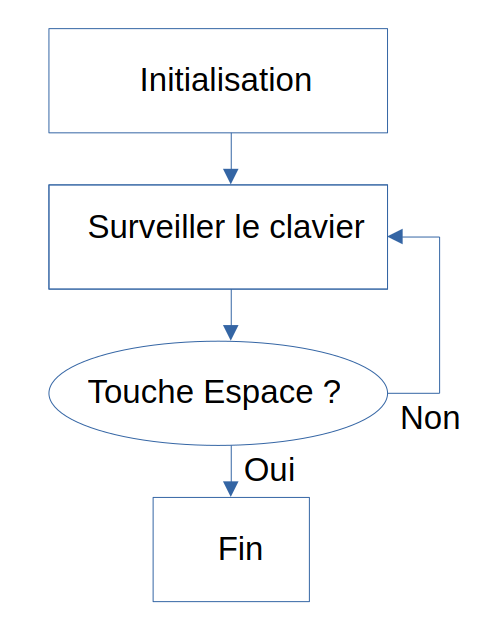 Dans l'exemple ci-dessous, un programme simple s'initialise (par exemple, affiche le message "appuyez sur la touche espace") et attends qu'on appuie sur la touche espace. Pour ce faire, on doit