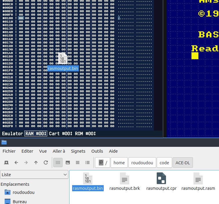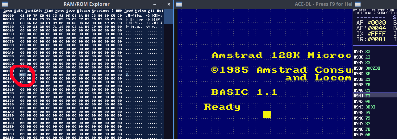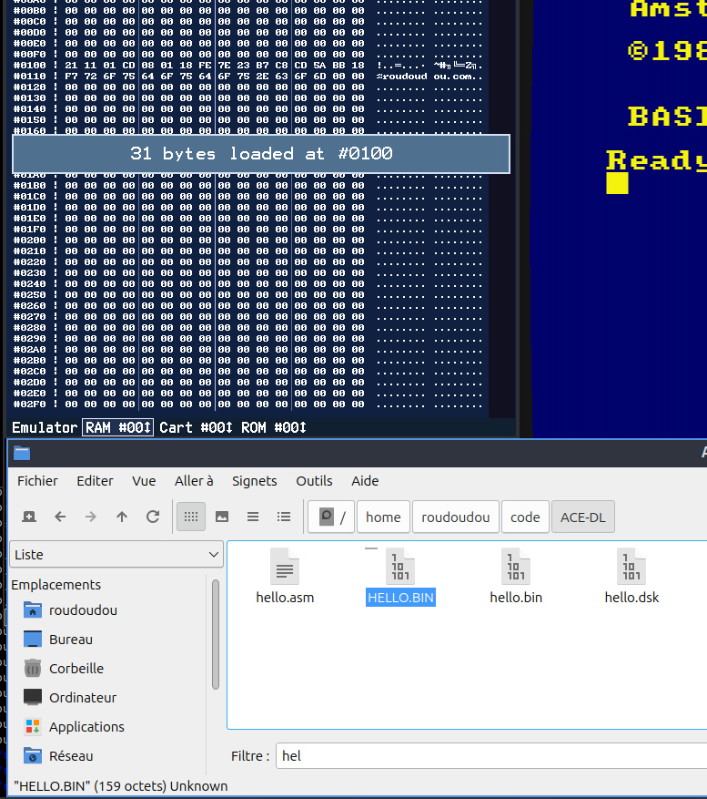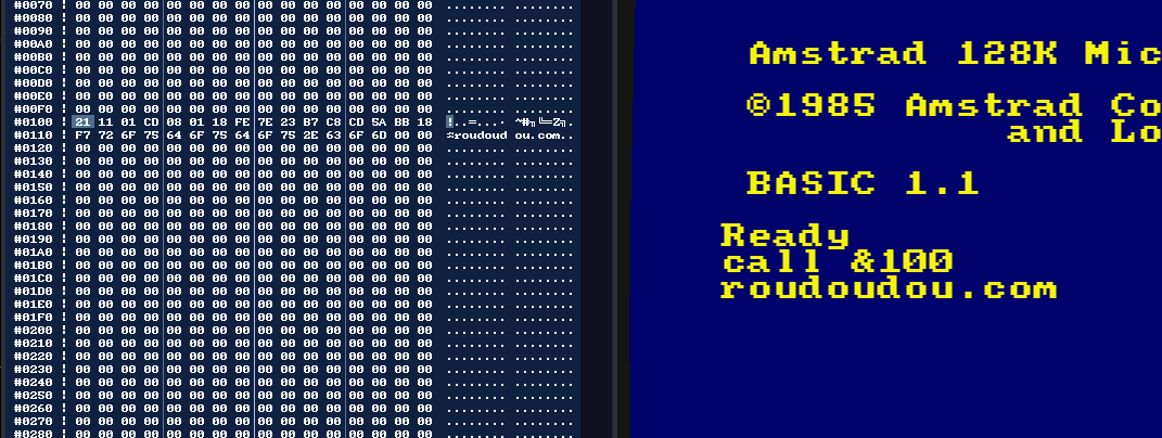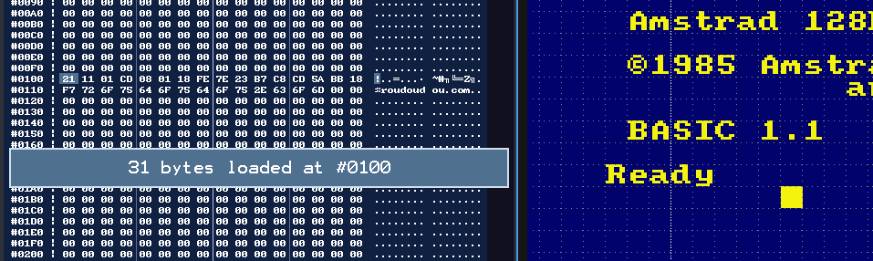 Lancer notre programme dans ACEOn va utiliser notre 'Hello World'. Vous n'avez toujours pas besoin de le comprendre, le but de cet article est de présenter les différentes façons d'utilise un programme avec notre émulateur. Soit en utilisant une disquette, soit en injectant dans la mémoire, etc. L'idée est que vous ayez le choix de la façon dont vous allez travailler. ORG #100 ; spécifie à quelle adresse on doit assembler notre programme LD HL,message CALL print_message JR $ ; boucle infinieprint_message LD A,(HL) : INC HL ; récupérer un octet et avancer dans le tableau OR A : RET Z ; si l'octet est nul, on sort de la routine CALL #BB5A ; afficher le caractère avec le vecteur système JR print_message ; et on recommence message DEFB 'roudoudou.com',0 En l'état, ce programme va s'assembler et produire un binaire. Très bien, mais qu'est-ce qu'on en fait? Il est possible d'importer ce binaire dans la mémoire d'ACE-DL via l'explorateur mémoire et ensuite de l'appeler avec un CALL depuis le BASIC. Ce n'est pas la solution la plus simple alors j'en parlera à la fin de cet article Executer un snapshot dans ACEC'est ma méthode préférée, le snapshot peut injecter dans ACE de la RAM et de la ROM. ACE peut même rester ouvert dans un coin car il surveille si le fichier snapshot est modifié. Auquel cas il va le recharger tout seul. Il faut ajouter au tout début du programme les lignes suivantes pour assembler dans les premiers 64K de RAM : BUILDSNA BANKSET 0 ; assembler dans les premiers 64K RUN #100 ; pour dire à quelle adresse le snapshot doit démarrerVous pouvez exécuter ce programme dans ACE-DL avec la ligne de commande suivante Linux (utilisez le nom du .exe sous windows) ./AceDL rasmoutput.snaNote: Cette façon d'injecter de la mémoire dans ACE pose un problème avec l'utilisation des vecteurs systèmes car la mémoire envoyée ne contiendra QUE votre programme. Si vous voulez utiliser les vecteurssystèmes avec un snapshot, il faudra d'abord faire un snapshot de la mémoire depuis le Basic (F4 dans ACE). Idéalement et pour éviter les ennuis, faites un POKE &4000,&ED : POKE &4001,&FF : CALL &4000 après avoir activé les points d'arrêt de type Winape (depuis l'émulation faire F8 puis activer les points d'arrêt Winape EDFF). Une fois la machine arrêtée par le point d'arrêt, faites F4 pour enregistrer votre snapshot, il sera dans un état "stable".Ensuite vous pourrez l'importer dans votre source de la façon suivante : SNAPINIT 'image6128.sna' ; la mémoire de Rasm est initialisée avec le snapshot BUILDSNA SNASET GA_ROMCFG,%1100 ; pour être sûr de démarrer dans la mémoire, on les désactive du snapshot au cas où BANKSET 0 ; assembler dans les premiers 64K RUN #100 ; pour dire à quelle adresse le snapshot doit démarrerEt voilà, vous utilisez la plus performante des méthodes, les symboles de votre programme sont automatiquement importées dans le débogueur, vous pouvez y accéder depuis l'explorateur mémoire ou la trace en appuyant sur la touche L et commencer à en taper quelques lettres. Ensuite, un clic (ou un double-clic) vous téléportera à l'emplacement du label. Il existe d'autres méthodes que je vous présente ci-dessous, si le snapshot ne vous plait pas ^_^. Enregistrer sur disquette et exécuter dans ACEIl est possible d'en faire un programme exécutable sur disquette en ajoutant la ligne suivante à la fin : SAVE 'HELLO.BIN',#100,$-#100,DSK,'hello.dsk'Vous pouvez exécuter ce programme dans ACE-DL avec la ligne de commande suivante Linux (utilisez le nom du .exe sous windows) ./AceDL hello.dsk -autoRunFile 'hello.bin'Faire un secteur de boot et exécuter dans ACEIl est même possible d'en faire un secteur de boot exécutable avec les lignes suivantes à la fin : EDSK CREATE,'ucpm.dsk',VENDOR,42,OVERWRITE ; create a vendor floppy EDSK WRITESECT,'ucpm.dsk',#100,$,'0:0x41'Vous pouvez exécuter ce programme dans ACE-DL avec la ligne de commande suivante Linux (utilisez le nom du .exe sous windows) ./AceDL ucpm.dsk -autoRunCPMImporter un binaire pur dans ACE (ce n'est pas le plus simple)Vous voulez vraiment savoir comment importer le binaire du début dans la mémoire? Zêtes têtu non? Ok, ok, on y va. D'abord vous lancez ACE et vous ouvrez un explorateur mémoire avec la touche F6. Comme vous le voyez sur la capture ci-dessous, l'explorateur s'ouvre par défaut sur l'espace mémoire émulé qui n'est généralement pas dans la mémoire vive de l'ordinateur mais avec la ROM 0 connecté, comme ici. Première chose, cliquer sur RAM pour basculer dans la mémoire vive.
