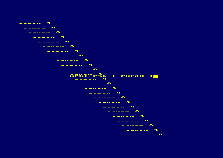 Il faudrait commencer par ajouter une pause, que l'on ait le temps de bien voir chaque écran en entier. Pour faire une pause, une grosse boucle et le plus simple. Notre Z80 ne réalise qu'un million d'opérations par seconde au maximum.