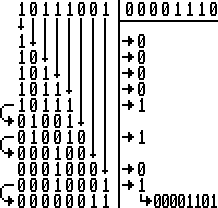 | Itération | Diviseur décalé | Peut-on soustraire? | Reste | Bit du quotient - Peut-on soustraire? (bis) |