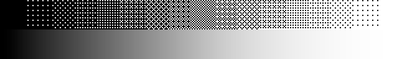Fondu entre deux images utilisant la même paletteSi vous avez raté l'interview de Mickaël Pointier chez Génération Micros, ben déjà allez la regarder, c'est pas très longet Mickaël réussi a être à la fois technique et accessible, c'est toujours un plaisir de l'écouter. Dans cette interview, il parle de son nouveau jeu [Encounter pour Oric] dans lequel il explique avoirréalisé des effets de transition avec une matrice de Bayer (enfin, il parle de tramage ordonné au sens général mais c'est Bayer qui nous intéresse). Alors histoire de bien voir ce qu'est une matrice de Bayer, voici un gradient du blanc au noir qui utilise une matrice 4x4 (matrice pour pompeusement parler d'un bête carré de 4 pixels par 4...).Sur l'image ci-dessous, ce carré est répété plusieurs fois pour aussi montrer que la trame qui le compose est AUSSI conçue pour les répétitions contiguës :)