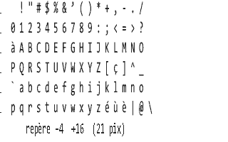 En accord avec la table ASCII de l'article précédent (tout à fait classique, sauf les 3 derniers caractères, je vais créer une fonte avec