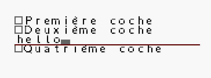 Tant que j'y étais, j'ai embelli la saisie texte pour avoir un petit curseur en surimpression, plus lisible. La suppression d'un char n'affiche plus deux fois de suite avec l'espace mais