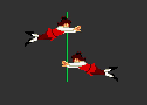 Intégration du miroir horizontal au moteurLe besoin le plus courant dans le jeu vidéo est la symétrie d'axe vertical. Comment allons-nous modifier notre moteur d'animation pour la gérer? D'abord, il faut convenir d'un sens d'affichage dans la structure de nos objets : struct s_animation animation defw positionx defw positiony defw destination defb ; poids fort de la destination hardware reverse defb ; sens d'affichage endstructOn a déjà le code d'inversion depuis [ L'article sur les miroirs et rotations ]. Modifions notre exécution pour gérer la variable "reverse" supplémentaire : ; IY = objet animation animate_execute_step push iy : pop hl ld e,(hl) : inc hl : ld d,(hl) : dec hl ; current step in 'animation' ex hl,de : ldi : ldi ; overwrite current step in 'animation' ld b,#DF : ld c,(hl) : inc hl : out (c),c ; connexion de la bank contenant les données ld a,(hl) : inc hl : ld xl,a : ld xh,a ; backup du compteur dans XL et XH ld e,(hl) : inc hl : ld d,(hl) : inc hl : push hl : ex hl,de ; HL=sprite data source ld d,(iy+s_animation.destination) ; on n'initialise plus E ! ld b,hi(hsp_conversion) ; poids fort pour la table de conversion ld a,(iy+s_animation.reverse) : dec a : jp z,.unpack_hsp_reverseAssez peu de changements, on n'initialise plus le poids faible de la destination (registre E) car l'affichage en inverse ne part pas de zéro. Enfin, un dernier test avant la copie va nous diriger soit vers la copie classique, soit vers la copie inversée. Si on voulait gérer plus de transformations, il serait judicieux de placer directement un pointeur de saut à cet endroit et l'intégrer dans l'objet. Que manque-t'il pour compléter le moteur? Ah oui! La routine d'affichage inverse, avec une lecture des delta modifiée! ;*************************************************************** .unpack_hsp_reverse ;*************************************************************** ld e,15 ; on part de la FIN de la ligne destination .unpack_hsp_reverse_loop repeat 8,x ld a,(hl) : inc l : ld (de),a : dec e ld c,a : ld a,(bc) : ld (de),a if x<7 : dec e : else ; on décrémente SAUF sur le dernier pixel écrit ld a,e : add 31 : ld e,a ; on revient au point de départ, +16 pour être à la fin de la ligne suivante :) endif rend ; la dernière comparaison change, on ne teste plus le retour à zéro mais le dépassement de 255 jr nc,.unpack_hsp_reverse_loop dec l : inc hl inc d ; next sprite dec xl ; E still at 15 jr nz,.unpack_hsp_reverse_loop ; DE = next sprite + 15La routine de copie termine un peu différemment (adresse du sprite suivant+15) mais cela ne va pas changer nos calculs car on récupère l'indice des sprites à modifier avec le poids fort. Par contre, qui dit copie inversée en symétrie verticale, dit une inversion des deltaX lus, tout simplement une soustraction au lieu d'une addition. C'est la seule différence. ld a,d : sub #40 : sub xh : ld c,xh add a : add a : add a : ld xh,#60 : ld xl,a ld hl,(iy+s_animation.positionx) : ld de,(iy+s_animation.positiony) pop iy : ld a,c ; IX=info du premier sprite dans l'ASIC ; IY=info de placement des sprites ; HL=x DE=y du premier sprite ; A=nombre de sprites ; SetMetaSprite ; **** d'abord boucler sur les X ************ push af,de,ix : ld de,8 .modifyXreverse exa ld c,(iy+0) ld a,c : add a : sbc a : ld b,a ; faire une valeur 16 bits signées à partir de C xor a : sbc hl,bc ; modifier le X avec l'inverse du modificateur ld (ix+0),hl add ix,de inc iy exa : dec a : jr nz,.modifyXreverse pop ix,hl,af .modifyYreverse exa ld c,(iy+0) ld a,c : add a : sbc a : ld b,a ; faire une valeur 16 bits signées à partir de C add hl,bc ; modifier le X ld (ix+2),hl add ix,de inc iy exa : dec a : jr nz,.modifyYreverse retAvec ce premier jet, Esteban s'affiche bien dans les deux sens... ...mais il est centré sur les coordonnées (avant DeltaX) du premier sprite de notre objet