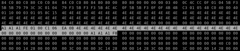 Pour la création d'une protection plus évoluée, l'opérateur devait créer un script dans le format FreeForm, associé à un logiciel propriétaire qui permettait de définir bit à bit la piste. Un réglage fin sur la vitesse moteur permettait aussi de tasser les bits sur le tour de piste, pratique pour dépasser la capacité théorique de 6250 octets. Plus sale, on s'apercevait rapidement que l'entête piste ne servait à rien. On gagnait alors 146 octets à le supprimer. Enfin, les données du dernier secteur pouvaient même chevaucher le trou d'index (le secteur taille 6 de Fighter Bomber déborde de cette façon et rebique dans la GAP pré-sectorielle). Ci-dessous le début du dump IPF de la deuxième piste. Les données terminent sur 72 octets, suivie d'une énorme GAP de 76 octets. les 12 octets de synchronisation et le reste de l'entête surligné dans lequel on repère les informations secteur (piste 01/tête 00/ID C1/taille 06).