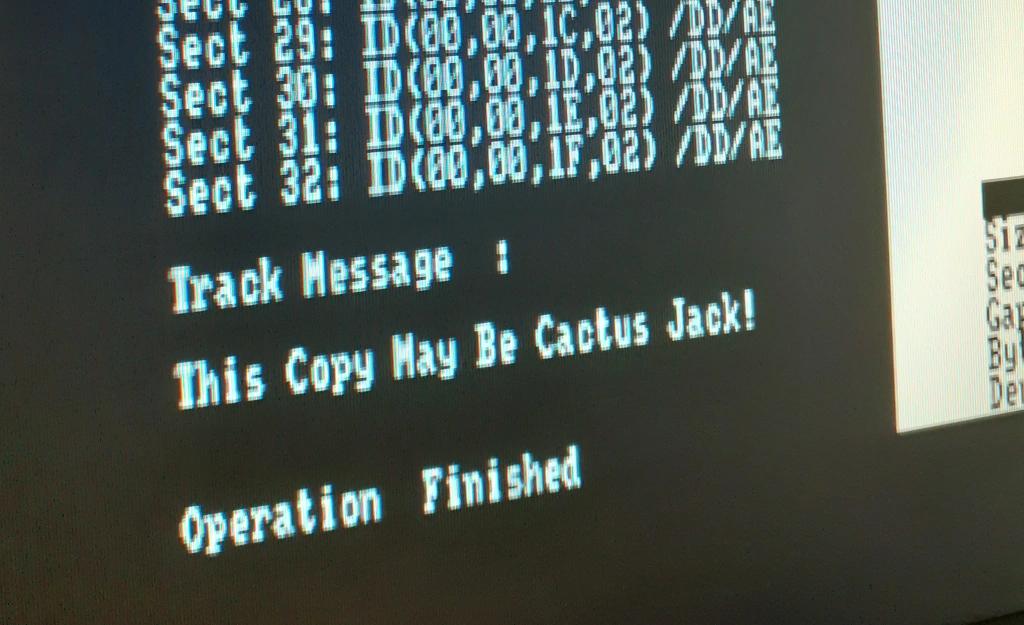 Au petit jeu de celui qui en mettra le plus, il est possible de s'amuser à dépasser les spécifications du FDC et mettre un peu plus de 64 secteurs (32 max théorique, 25 max réel) dépourvus de données. Une telle protection existe depuis 1986 que l'on retrouve sur les jeux 2112 AD , N.E.X.O.R. , Time and Motion, Working Backwards ainsi qu'une compilation. En recréant cette protection, j'ai découvert un amusant message dans Discology (peut-être uniquement le fruit de la traduction ?), et aussi vu qu'il ne plantait pas ! Attention, trop de secteurs sur Disc+Ultra vous amènera directement au reset !